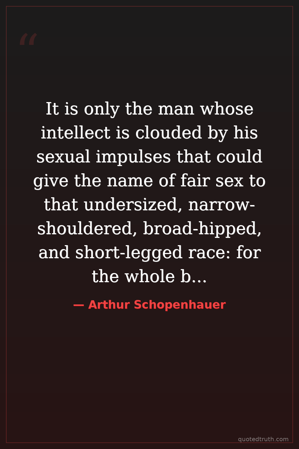 It is only the man whose intellect is clouded by his sexual impulses that could give the name of fair sex to that undersized, narrow-shouldered, broad-hipped, and short-legged race: for the whole beauty of this sex is bound up with this impulse.