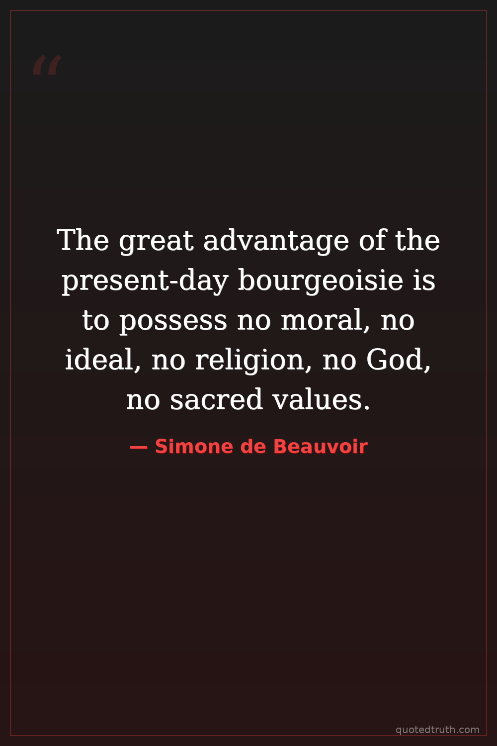 The great advantage of the present-day bourgeoisie is to possess no moral, no ideal, no religion, no God, no sacred values.