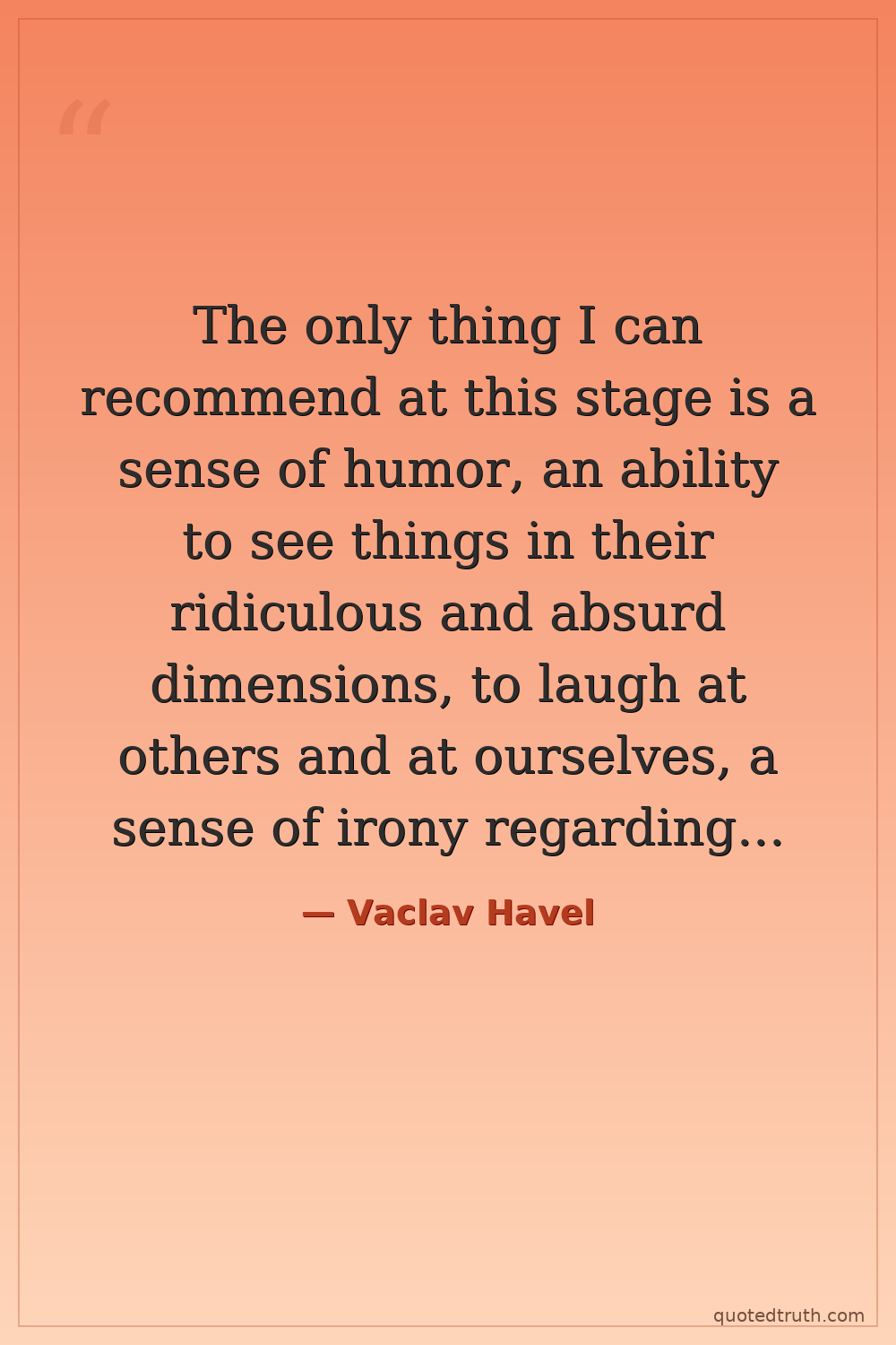 The only thing I can recommend at this stage is a sense of humor, an ability to see things in their ridiculous and absurd dimensions, to laugh at others and at ourselves, a sense of irony regarding everything that calls out for parody in this world. In other words, I can only recommend perspective and distance.