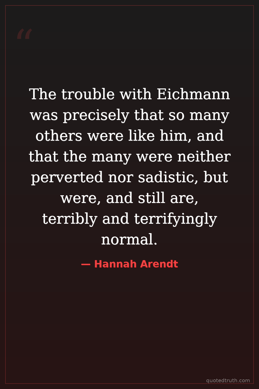 The trouble with Eichmann was precisely that so many others were like him, and that the many were neither perverted nor sadistic, but were, and still are, terribly and terrifyingly normal.