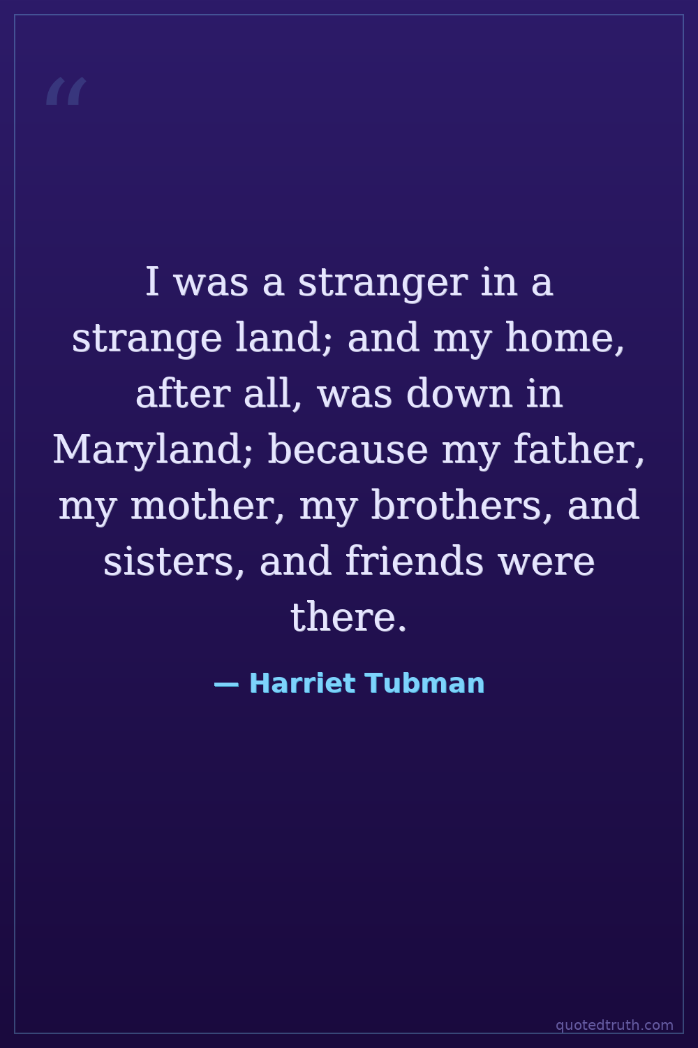 I was a stranger in a strange land; and my home, after all, was down in Maryland; because my father, my mother, my brothers, and sisters, and friends were there.