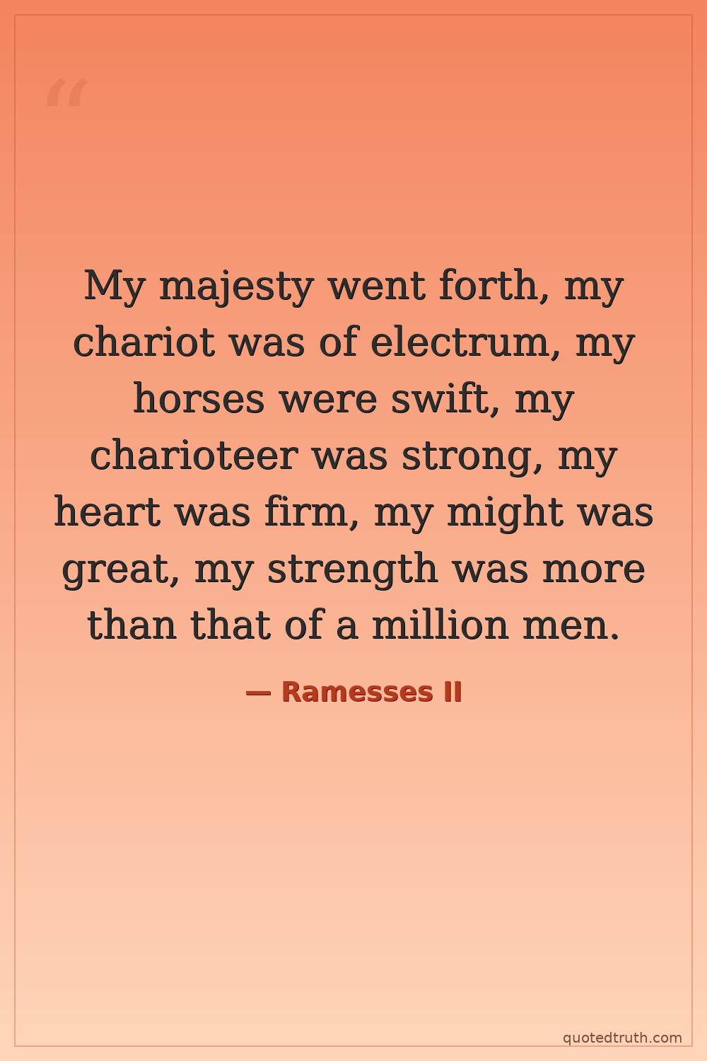My majesty went forth, my chariot was of electrum, my horses were swift, my charioteer was strong, my heart was firm, my might was great, my strength was more than that of a million men.