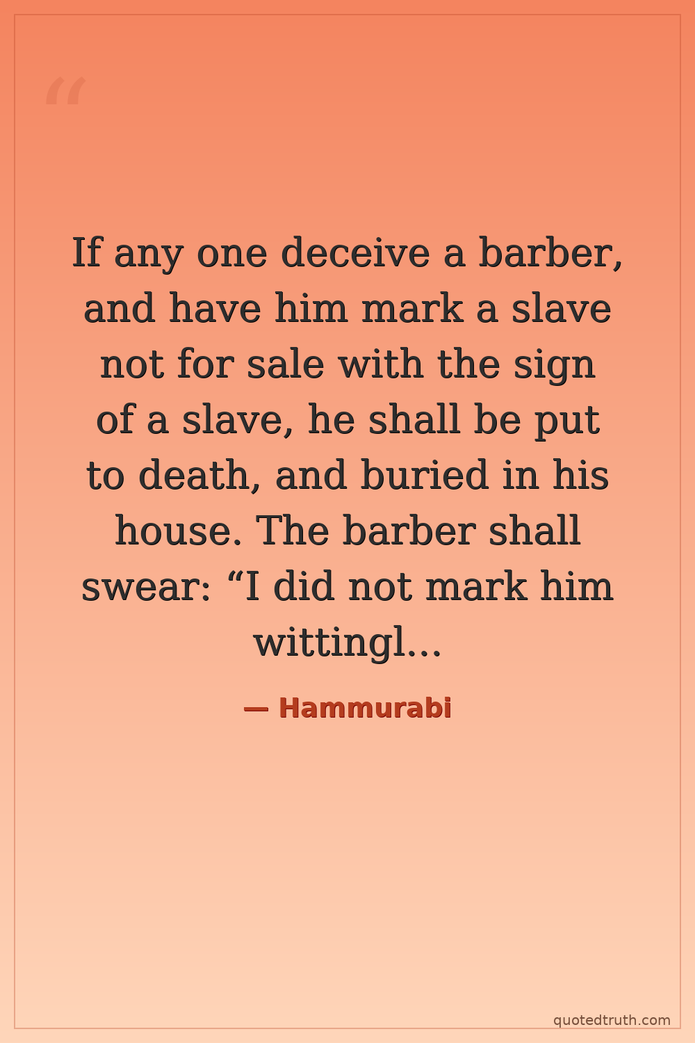 If any one deceive a barber, and have him mark a slave not for sale with the sign of a slave, he shall be put to death, and buried in his house. The barber shall swear: “I did not mark him wittingly,” and shall be guiltless. — Hammurabi Ancient Babylonian king, code of laws