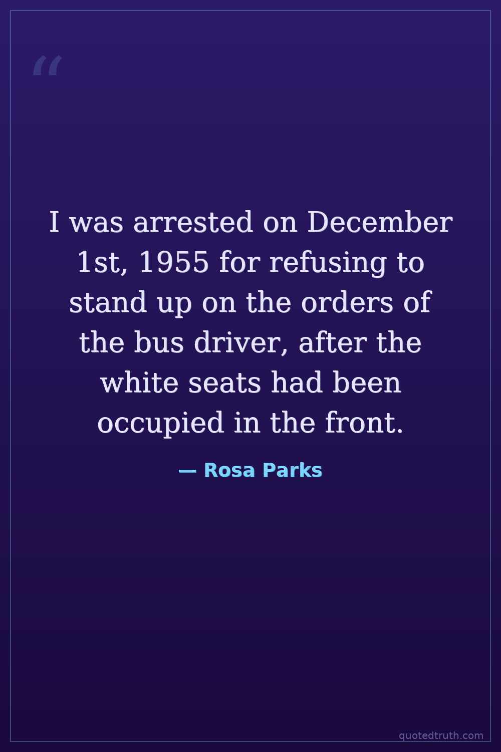 I was arrested on December 1st, 1955 for refusing to stand up on the orders of the bus driver, after the white seats had been occupied in the front.