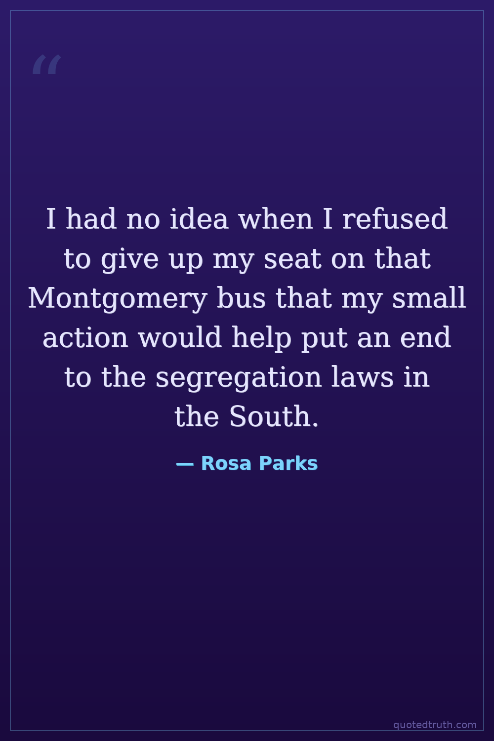 I had no idea when I refused to give up my seat on that Montgomery bus that my small action would help put an end to the segregation laws in the South.