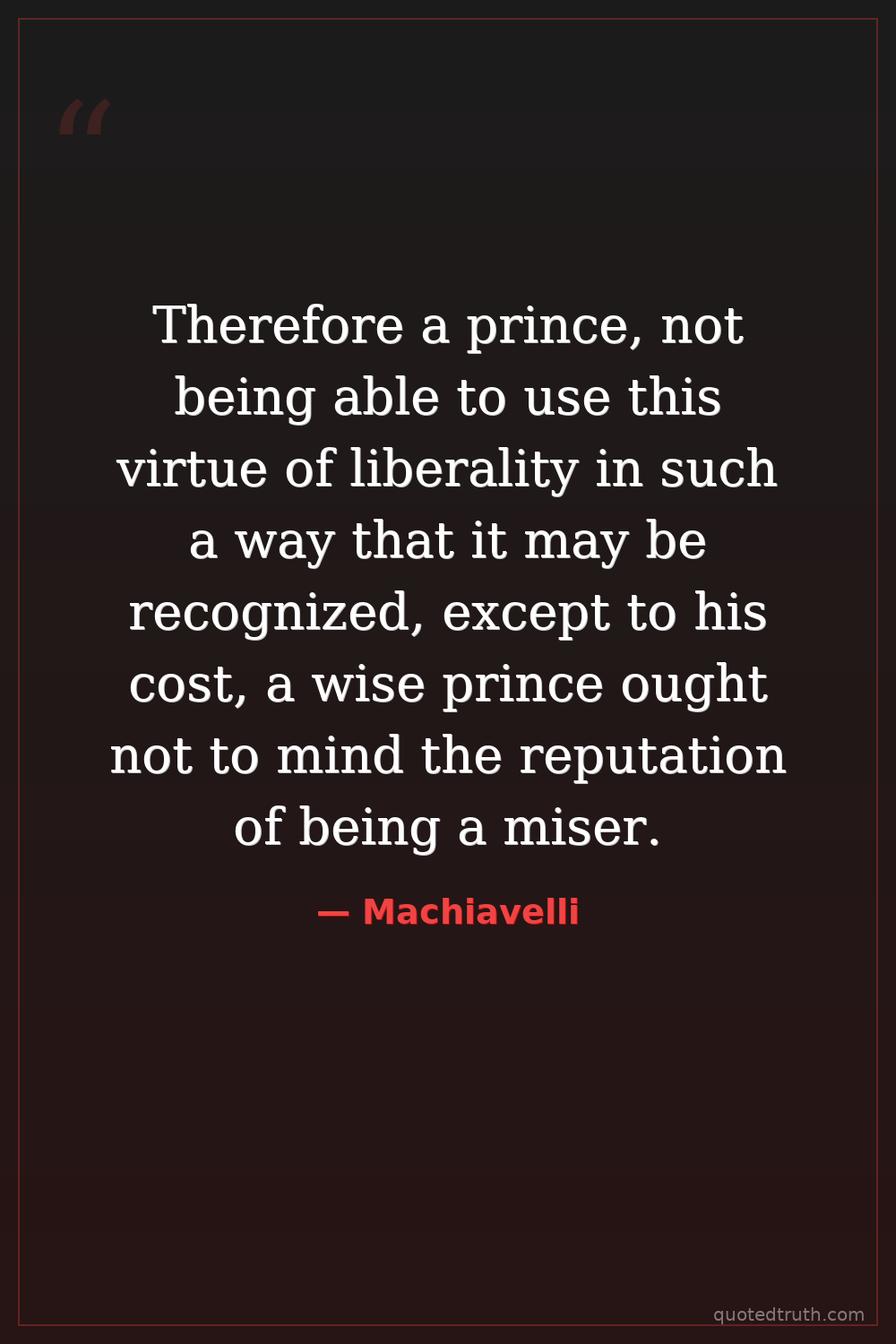 Therefore a prince, not being able to use this virtue of liberality in such a way that it may be recognized, except to his cost, a wise prince ought not to mind the reputation of being a miser.