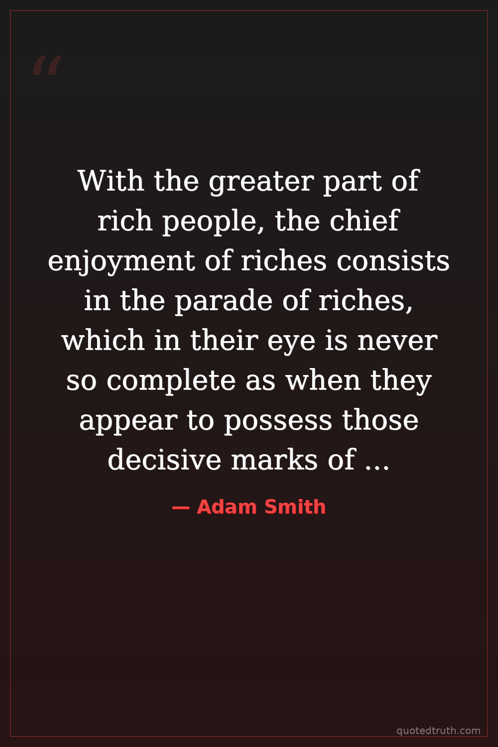 With the greater part of rich people, the chief enjoyment of riches consists in the parade of riches, which in their eye is never so complete as when they appear to possess those decisive marks of opulence which nobody can possess but themselves.