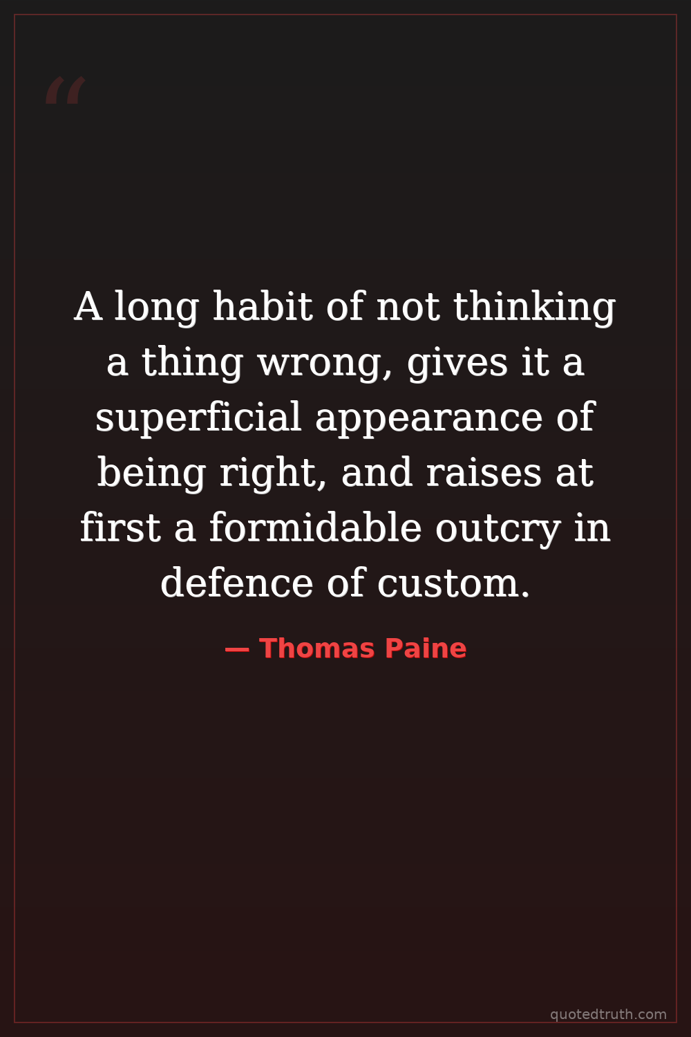 A long habit of not thinking a thing wrong, gives it a superficial appearance of being right, and raises at first a formidable outcry in defence of custom.