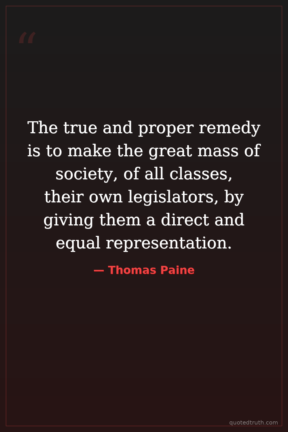 The true and proper remedy is to make the great mass of society, of all classes, their own legislators, by giving them a direct and equal representation.