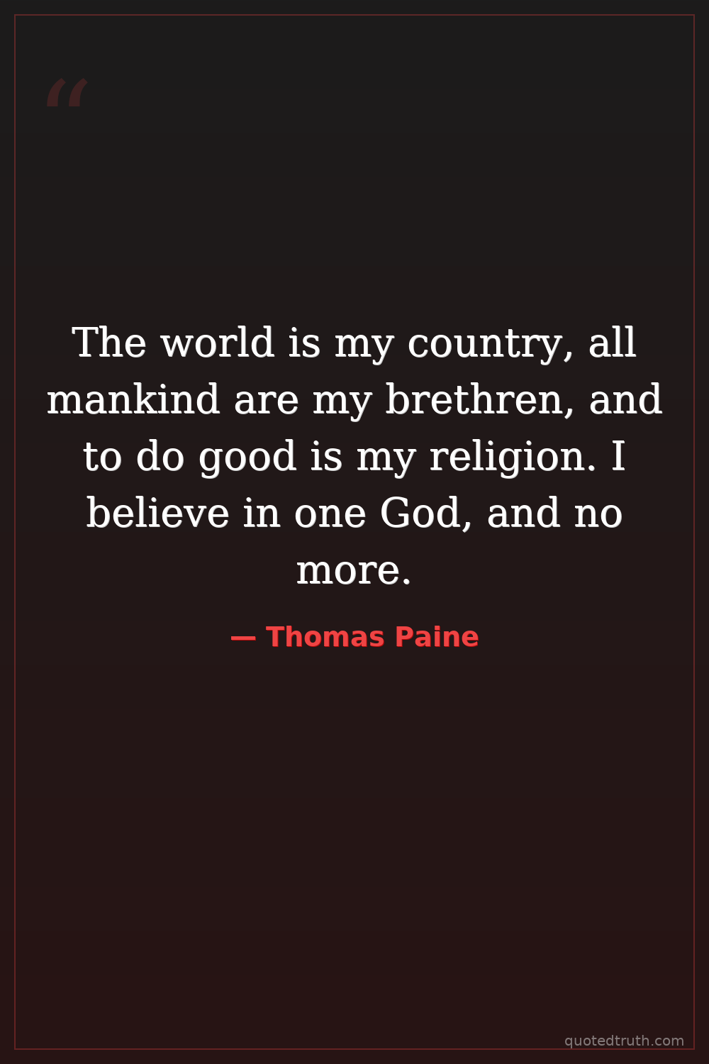 The world is my country, all mankind are my brethren, and to do good is my religion. I believe in one God, and no more.
