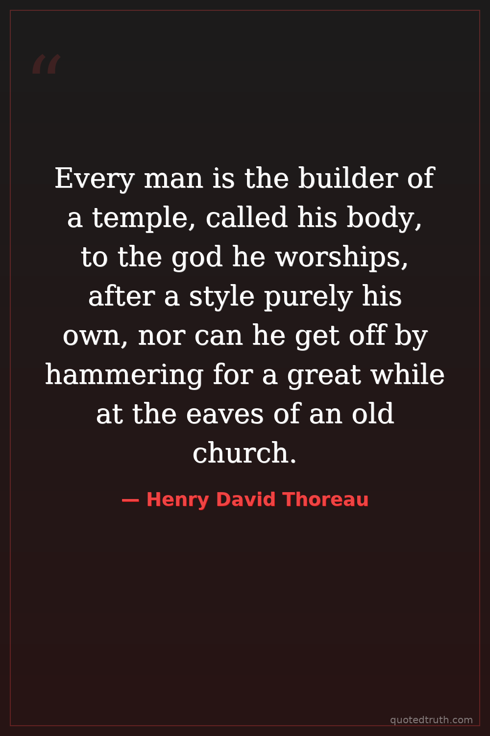 Every man is the builder of a temple, called his body, to the god he worships, after a style purely his own, nor can he get off by hammering for a great while at the eaves of an old church.