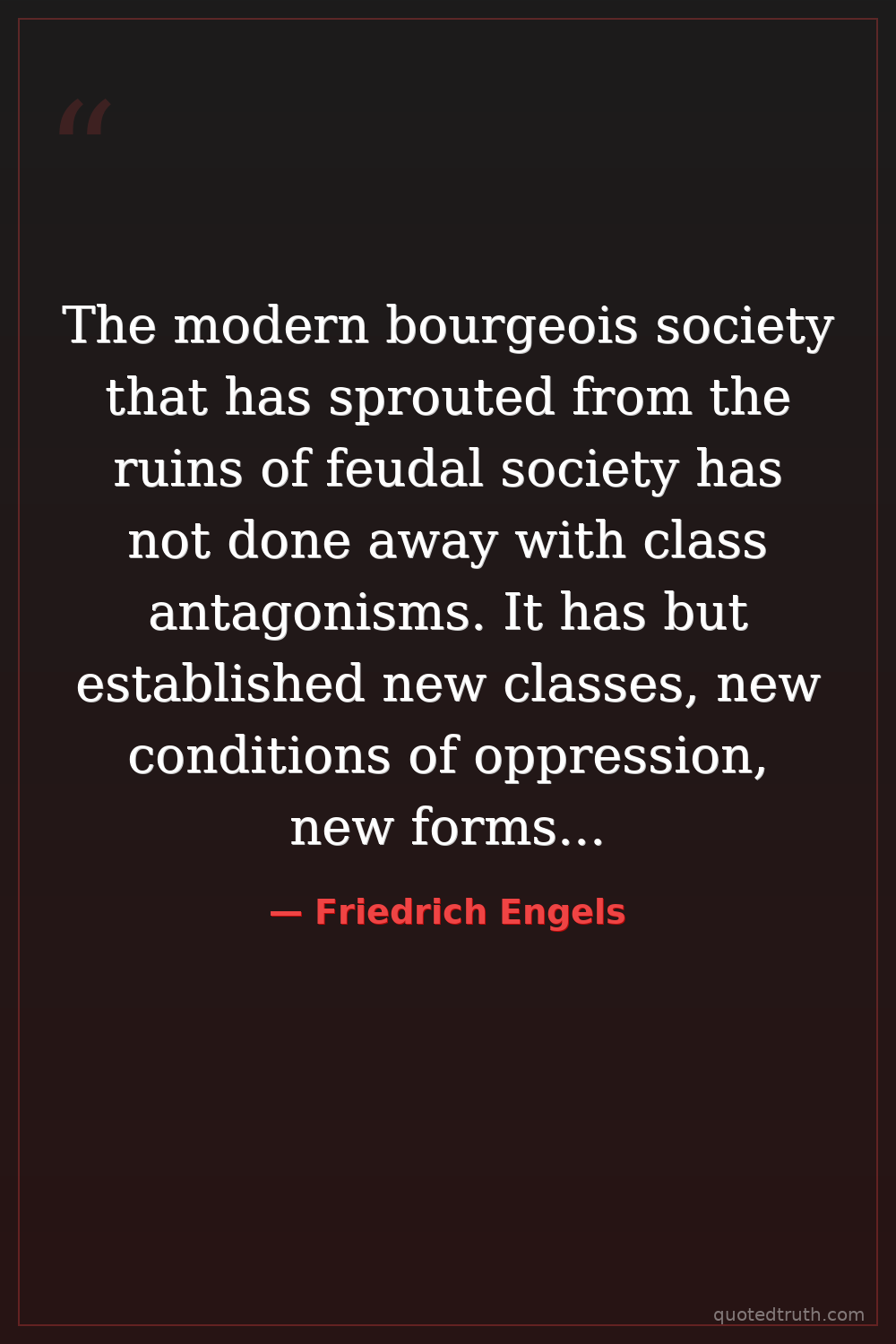 The modern bourgeois society that has sprouted from the ruins of feudal society has not done away with class antagonisms. It has but established new classes, new conditions of oppression, new forms of struggle in place of the old ones.