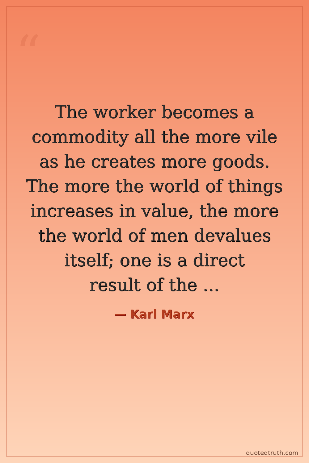 The worker becomes a commodity all the more vile as he creates more goods. The more the world of things increases in value, the more the world of men devalues itself; one is a direct result of the other.