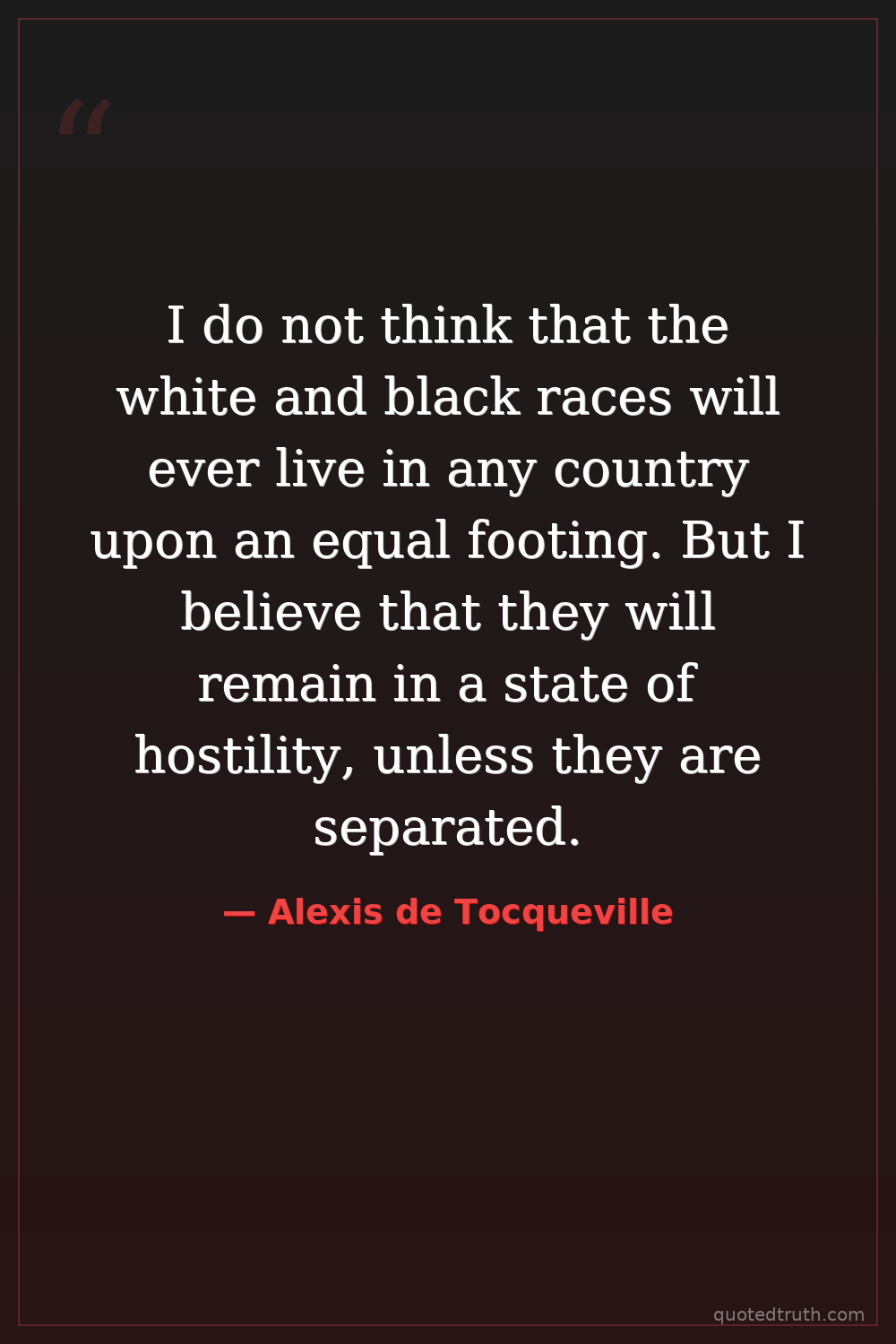 I do not think that the white and black races will ever live in any country upon an equal footing. But I believe that they will remain in a state of hostility, unless they are separated.