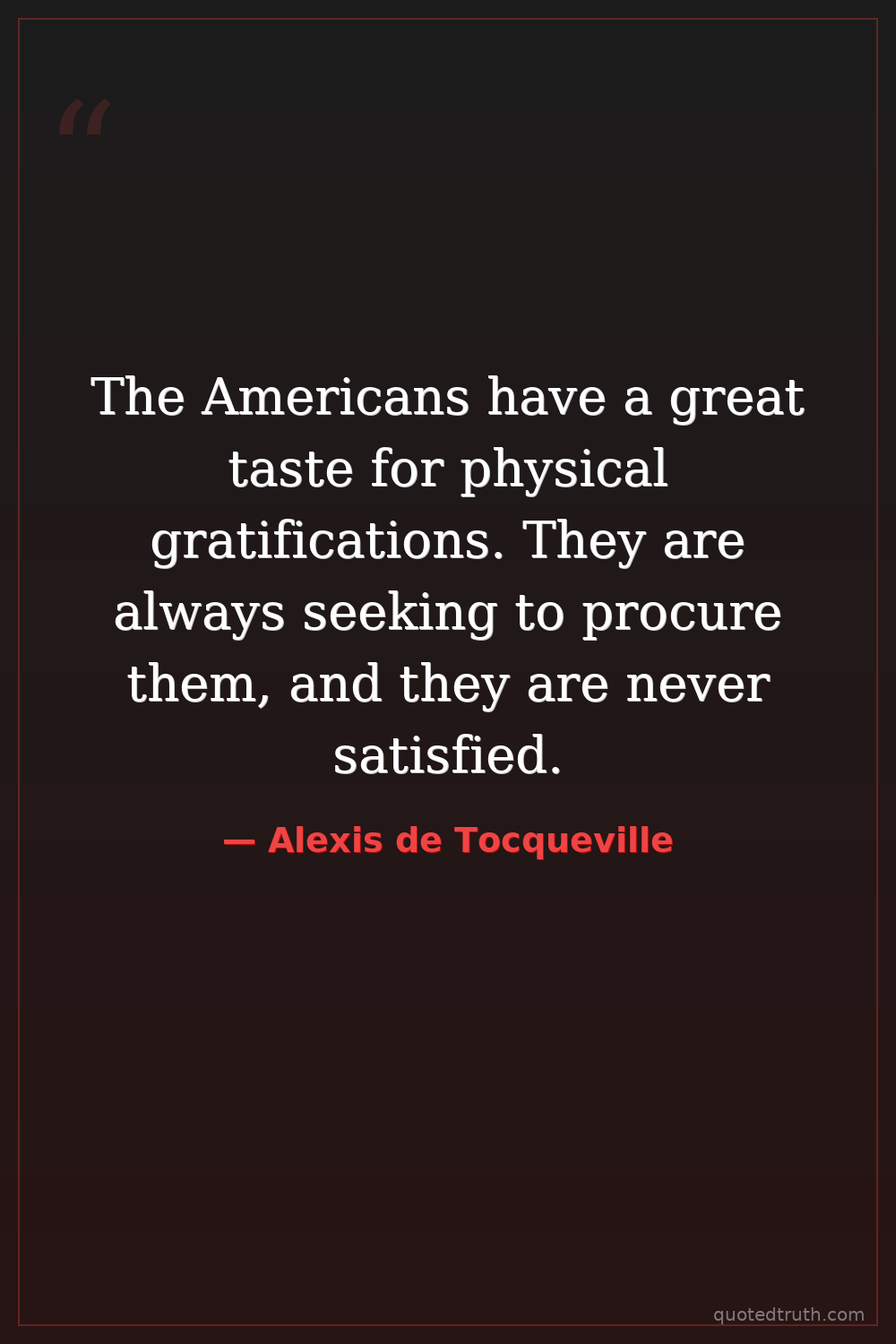 The Americans have a great taste for physical gratifications. They are always seeking to procure them, and they are never satisfied.