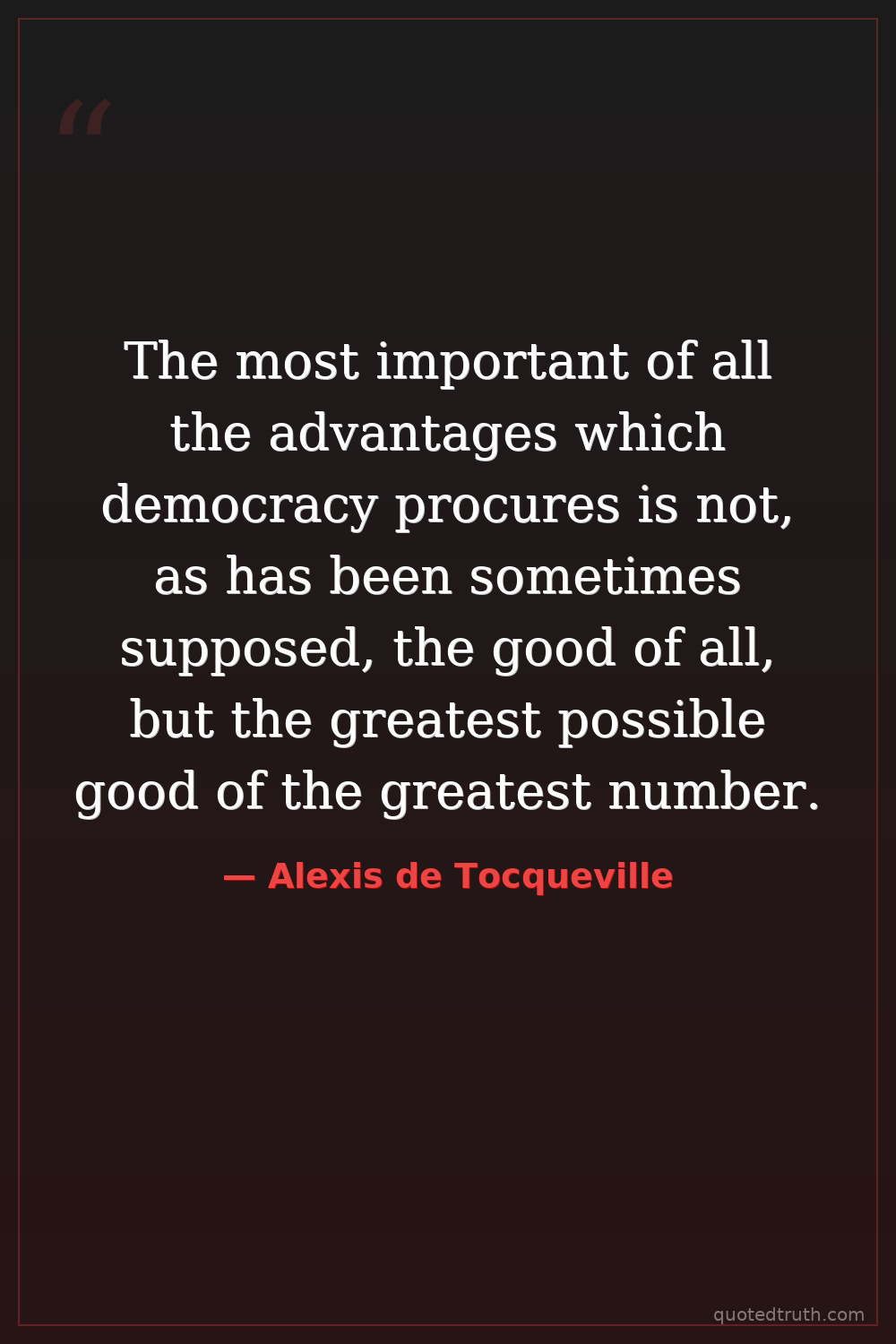 The most important of all the advantages which democracy procures is not, as has been sometimes supposed, the good of all, but the greatest possible good of the greatest number.