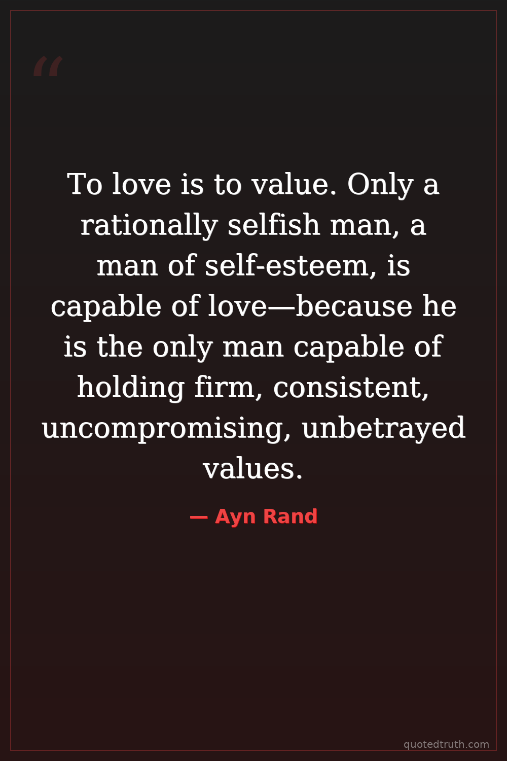 To love is to value. Only a rationally selfish man, a man of self-esteem, is capable of love—because he is the only man capable of holding firm, consistent, uncompromising, unbetrayed values.