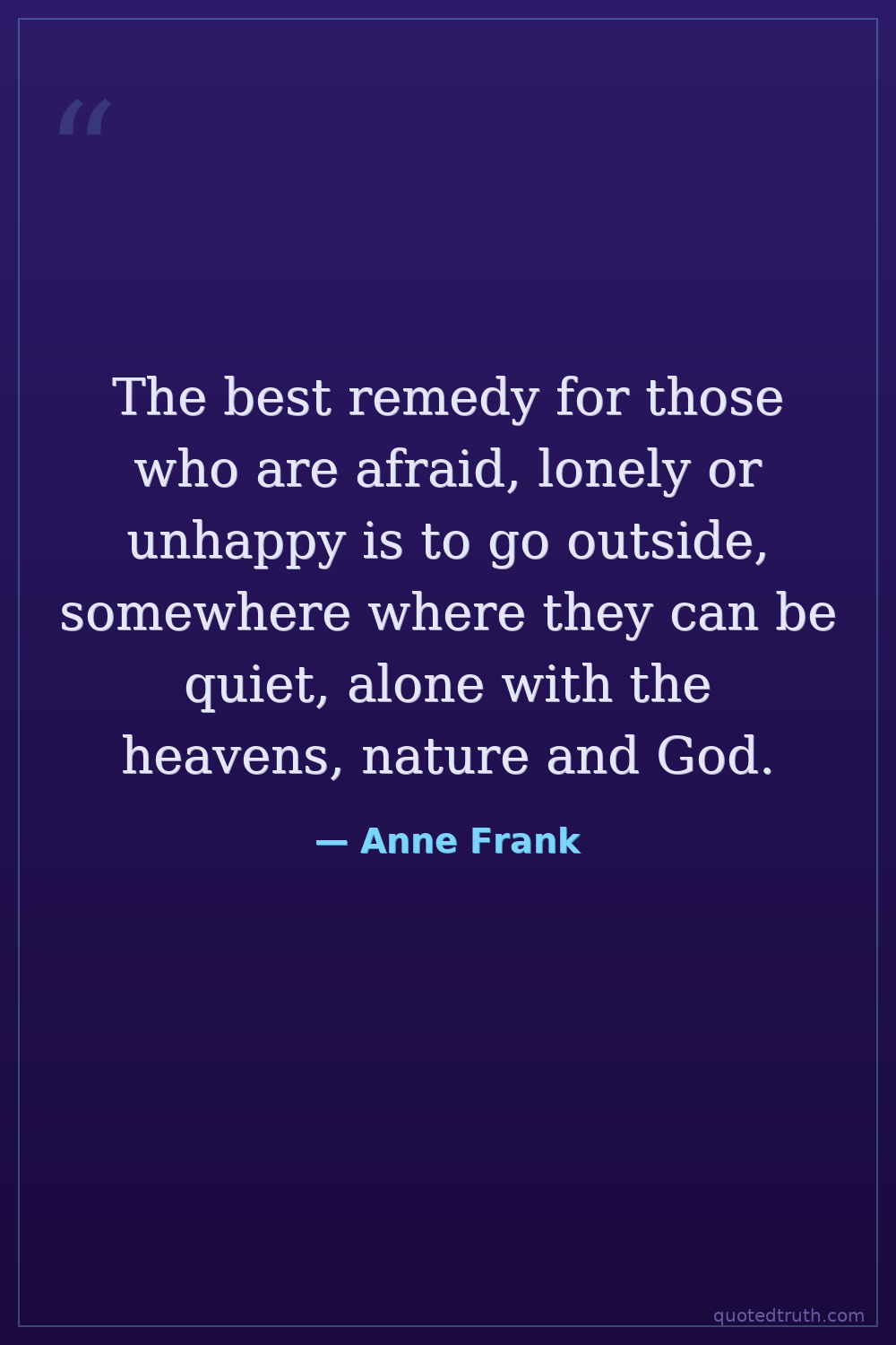 The best remedy for those who are afraid, lonely or unhappy is to go outside, somewhere where they can be quiet, alone with the heavens, nature and God.