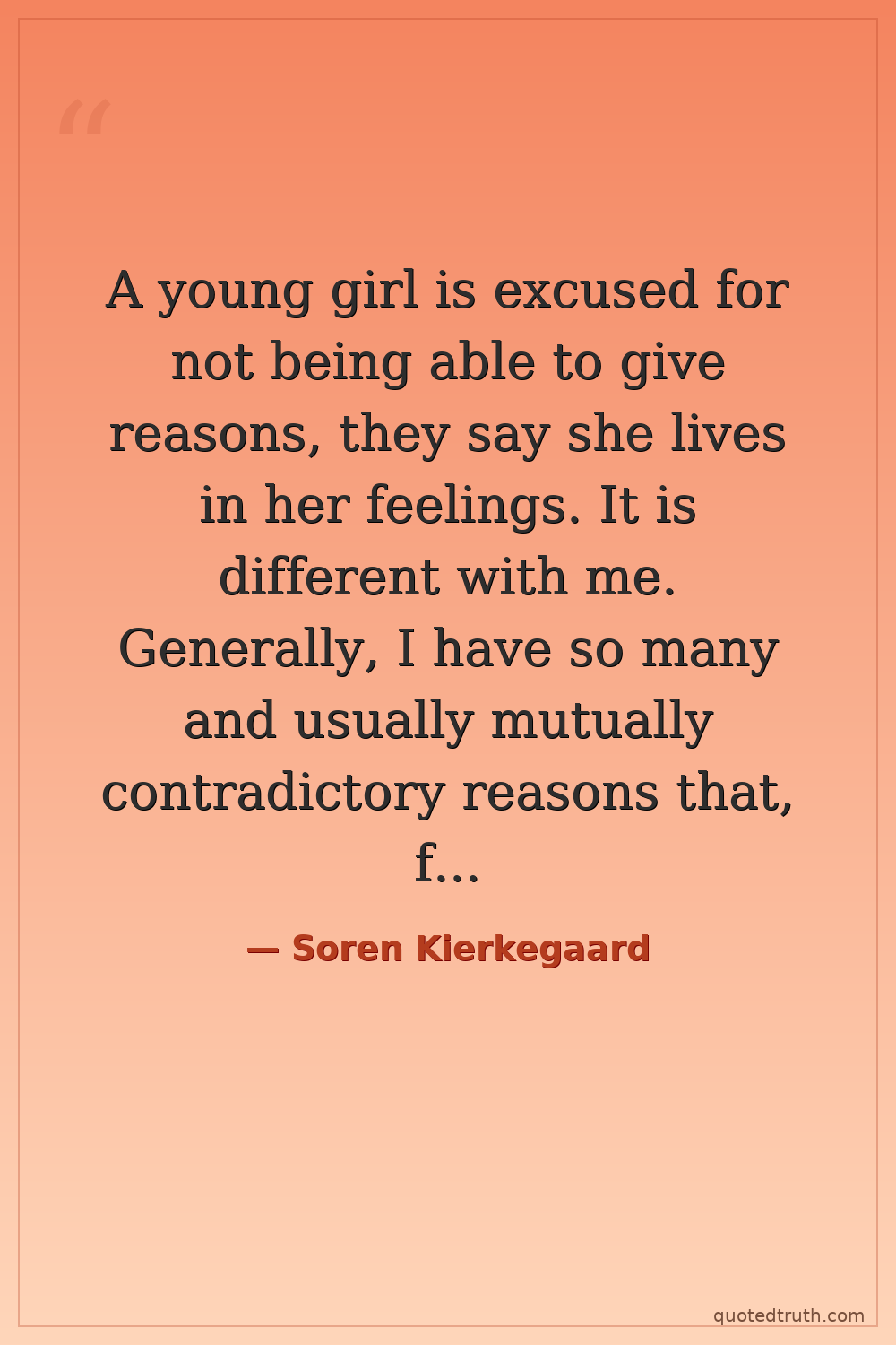 A young girl is excused for not being able to give reasons, they say she lives in her feelings. It is different with me. Generally, I have so many and usually mutually contradictory reasons that, for that reason, it is impossible for me to give reasons.