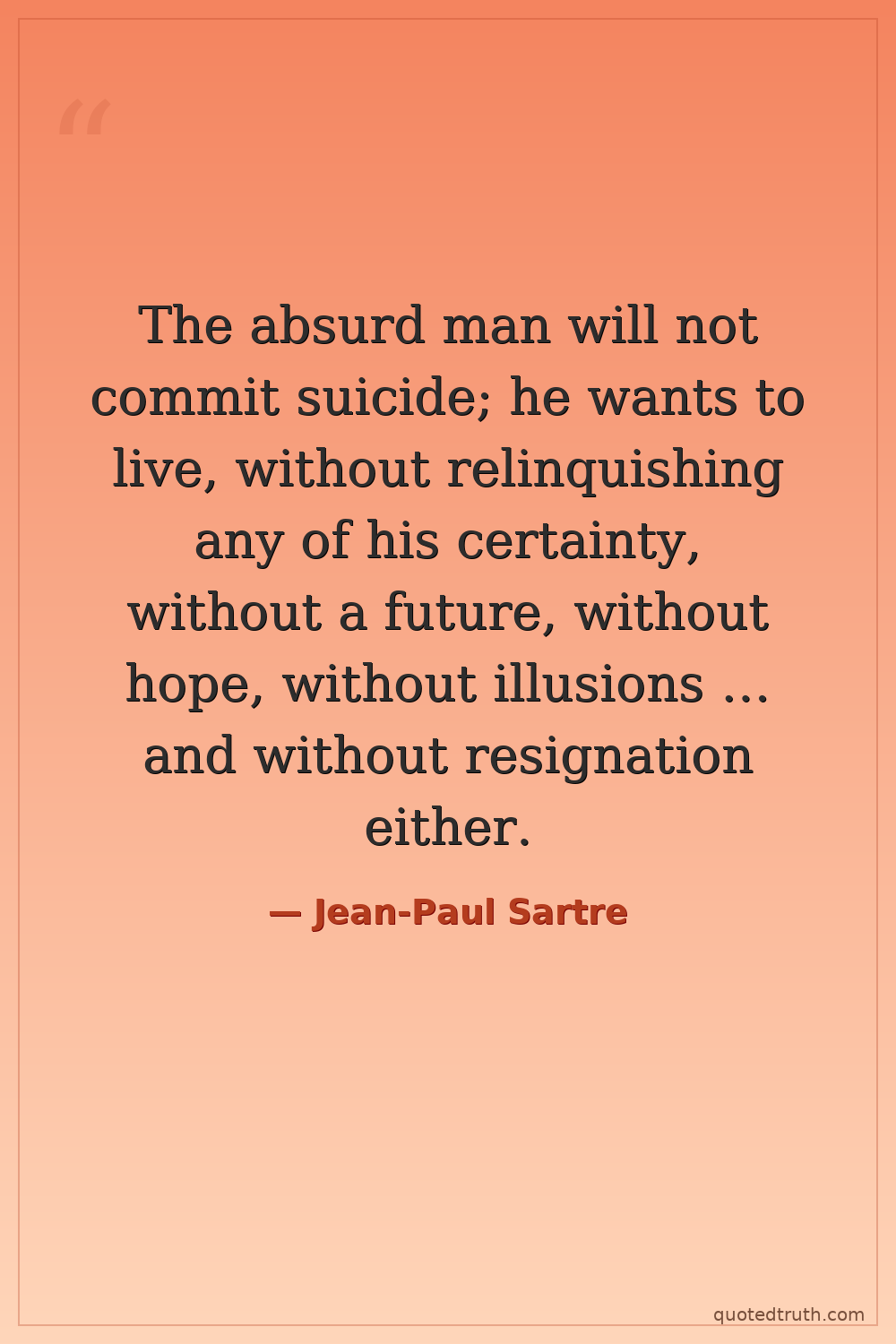The absurd man will not commit suicide; he wants to live, without relinquishing any of his certainty, without a future, without hope, without illusions … and without resignation either.