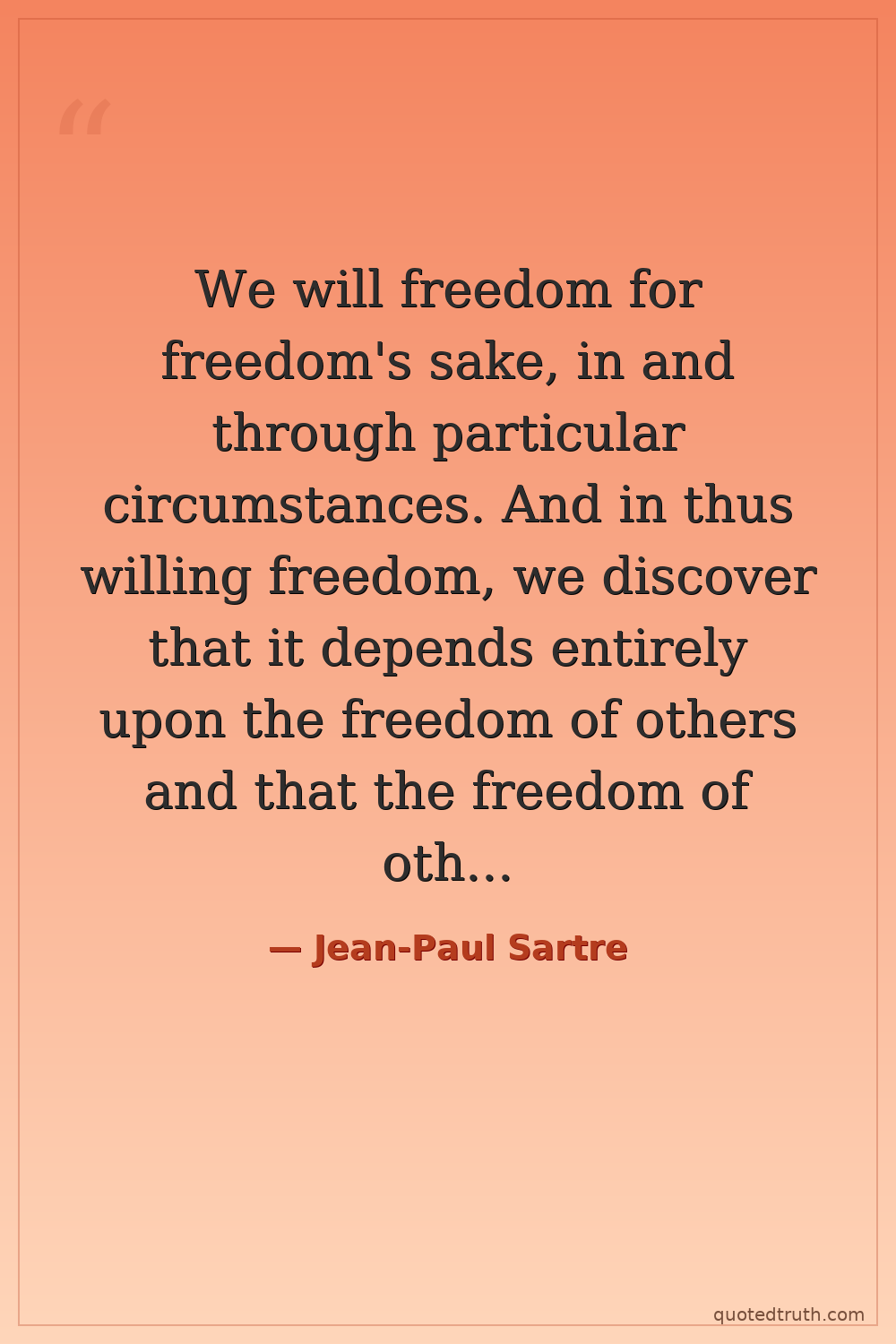 We will freedom for freedom's sake, in and through particular circumstances. And in thus willing freedom, we discover that it depends entirely upon the freedom of others and that the freedom of others depends upon our own.