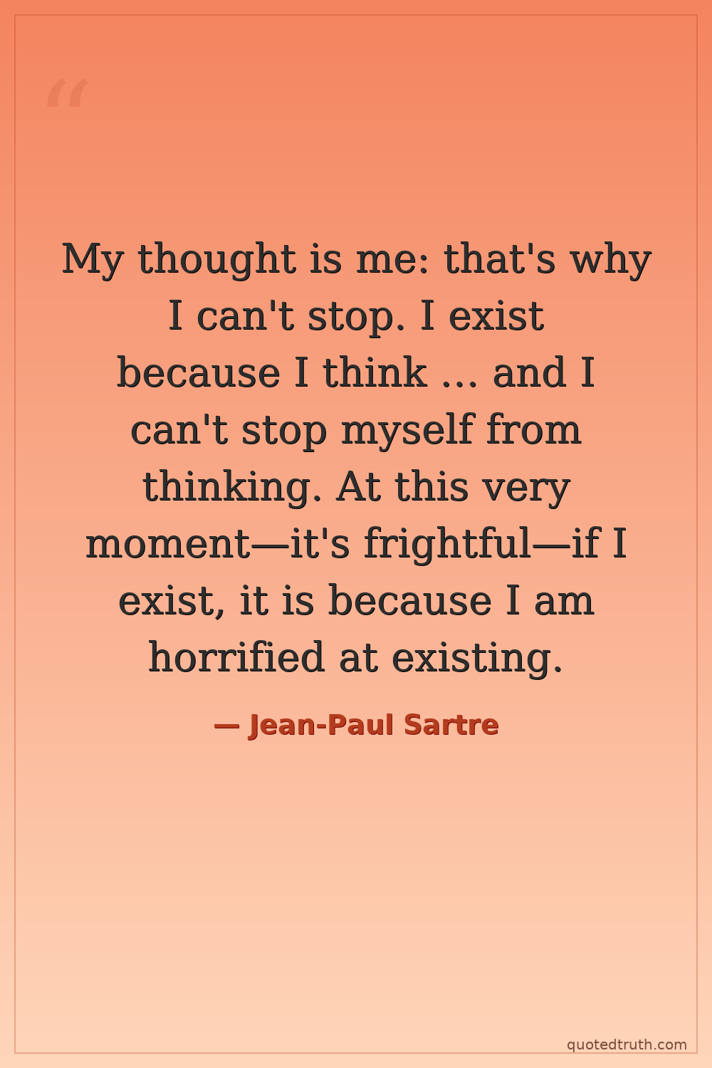 My thought is me: that's why I can't stop. I exist because I think … and I can't stop myself from thinking. At this very moment—it's frightful—if I exist, it is because I am horrified at existing.