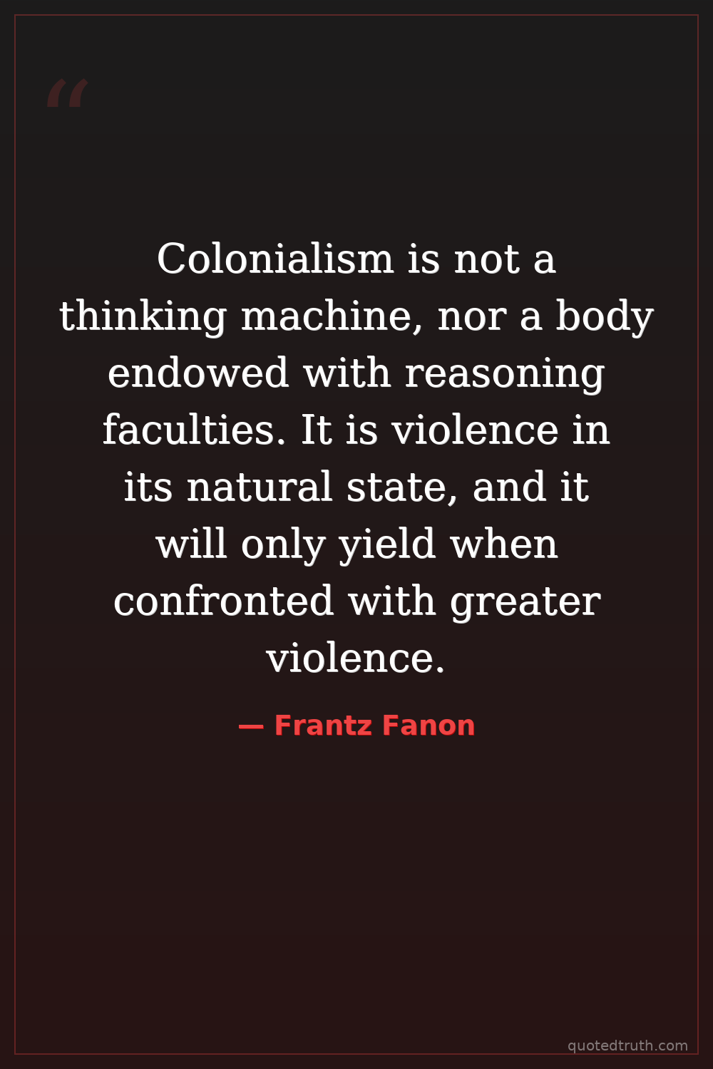 Colonialism is not a thinking machine, nor a body endowed with reasoning faculties. It is violence in its natural state, and it will only yield when confronted with greater violence.