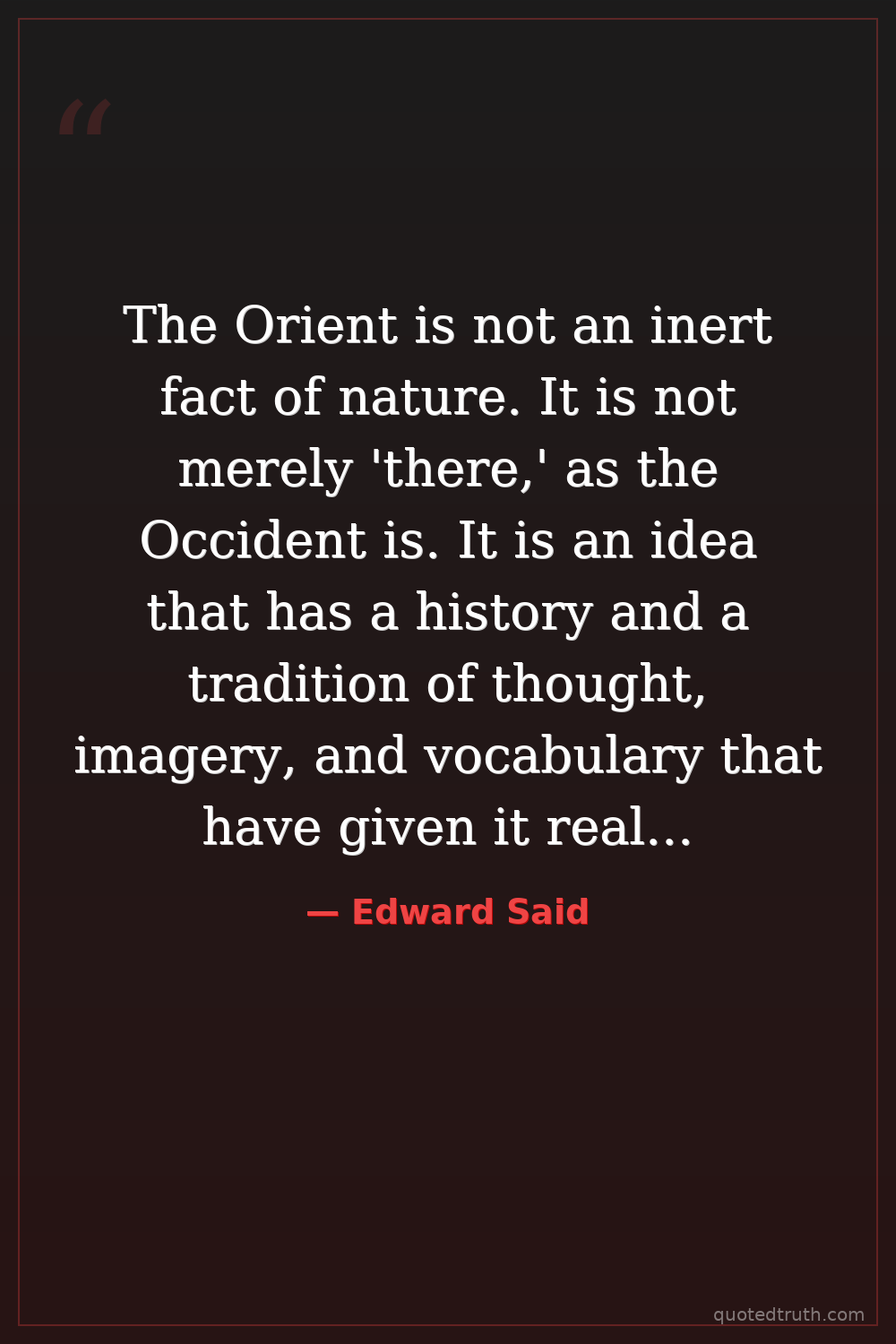 The Orient is not an inert fact of nature. It is not merely 'there,' as the Occident is. It is an idea that has a history and a tradition of thought, imagery, and vocabulary that have given it reality and presence in the West. — Edward Said Contemporary Orientalism, postcolonialism