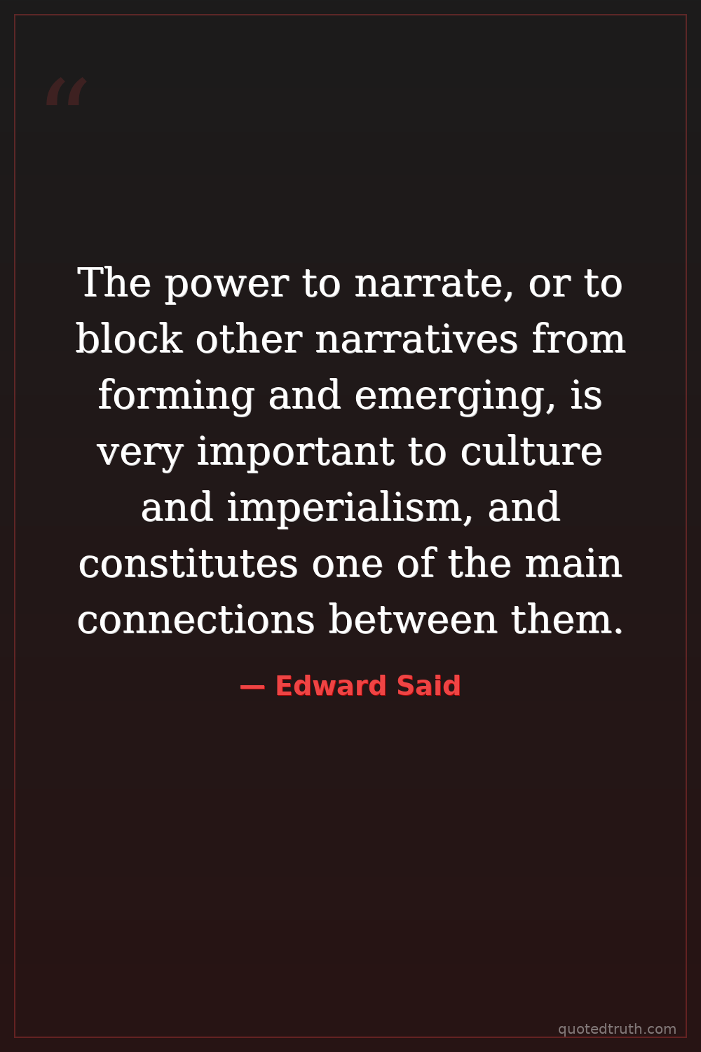 The power to narrate, or to block other narratives from forming and emerging, is very important to culture and imperialism, and constitutes one of the main connections between them.