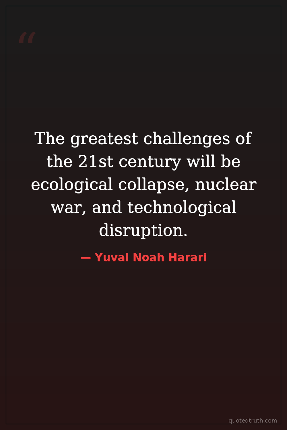 The greatest challenges of the 21st century will be ecological collapse, nuclear war, and technological disruption.