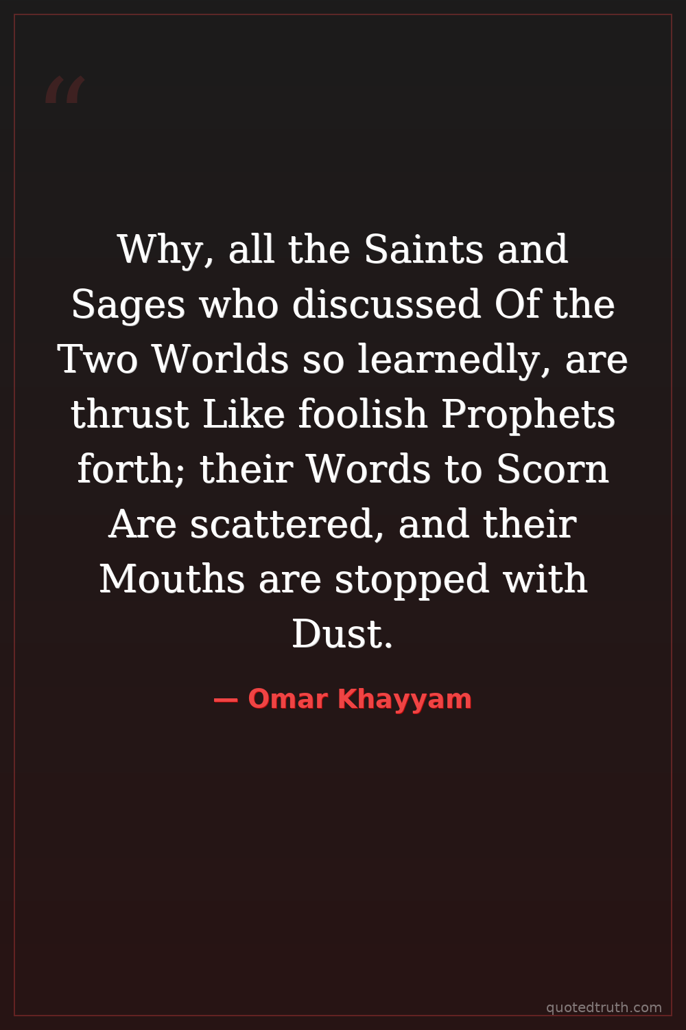 Why, all the Saints and Sages who discussed Of the Two Worlds so learnedly, are thrust Like foolish Prophets forth; their Words to Scorn Are scattered, and their Mouths are stopped with Dust.