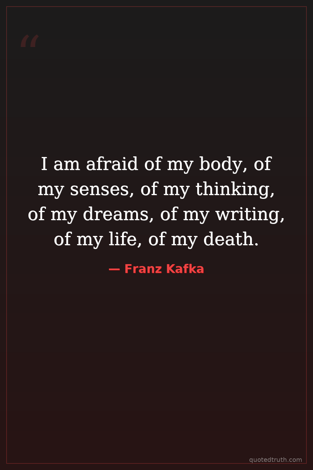 I am afraid of my body, of my senses, of my thinking, of my dreams, of my writing, of my life, of my death.