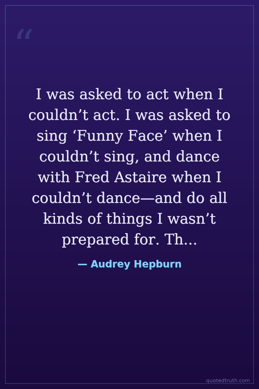 I was asked to act when I couldn’t act. I was asked to sing ‘Funny Face’ when I couldn’t sing, and dance with Fred Astaire when I couldn’t dance—and do all kinds of things I wasn’t prepared for. Then I tried like mad to cope with it. — Audrey Hepburn Modern Actress, humanitarian