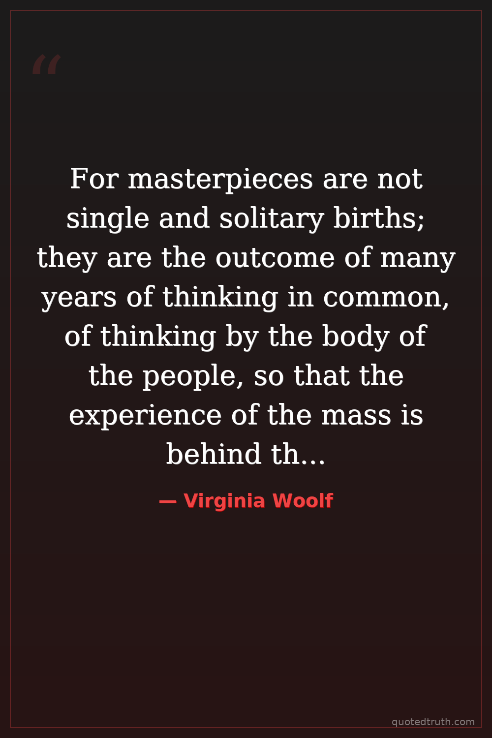 For masterpieces are not single and solitary births; they are the outcome of many years of thinking in common, of thinking by the body of the people, so that the experience of the mass is behind the single voice.