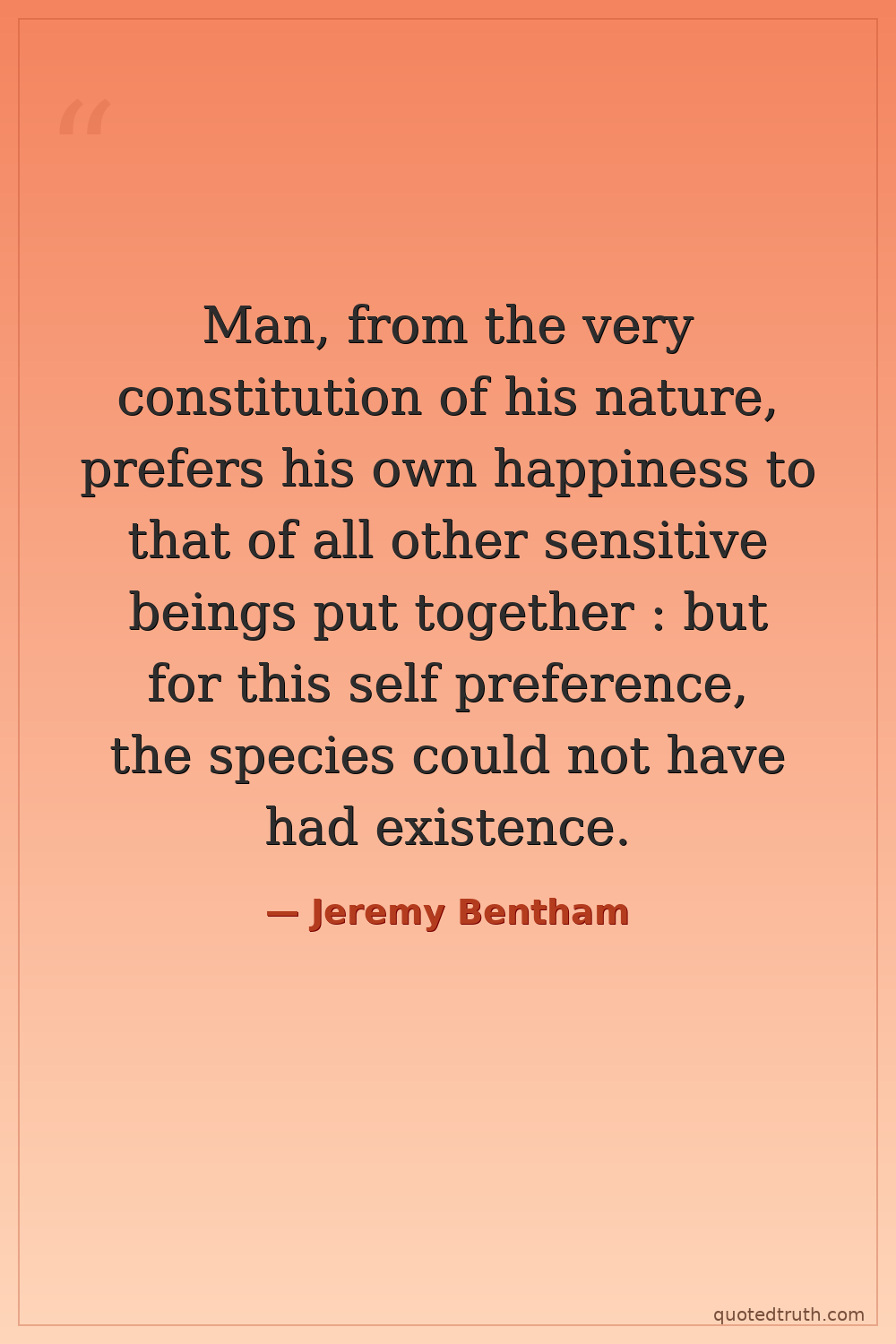 Man, from the very constitution of his nature, prefers his own happiness to that of all other sensitive beings put together : but for this self preference, the species could not have had existence.