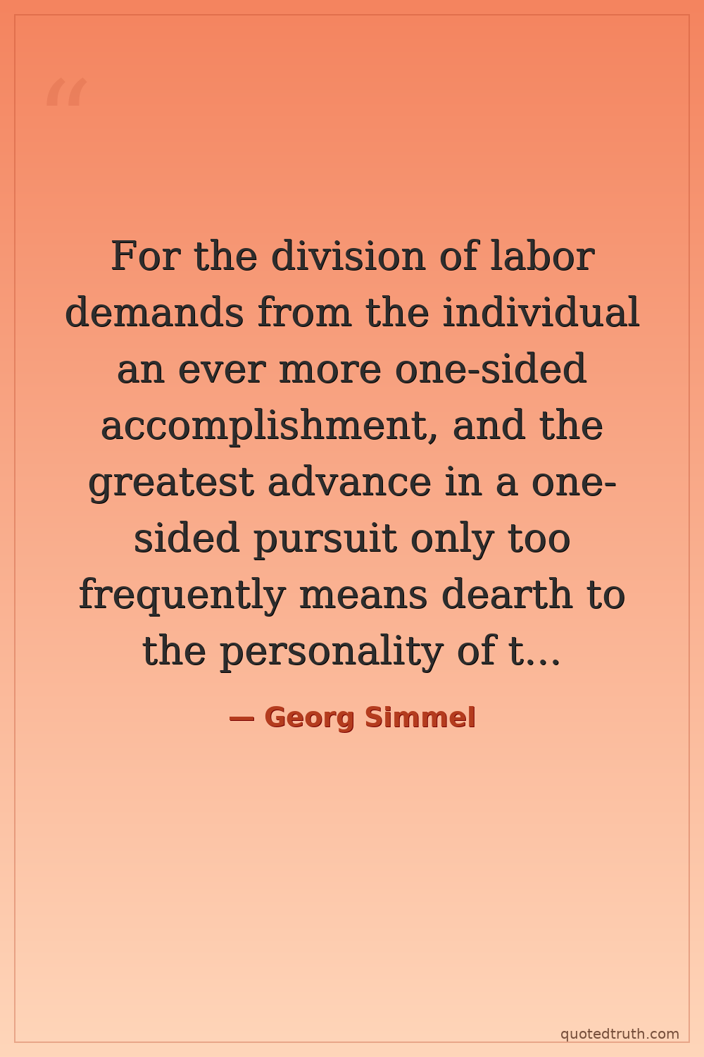 For the division of labor demands from the individual an ever more one-sided accomplishment, and the greatest advance in a one-sided pursuit only too frequently means dearth to the personality of the individual.