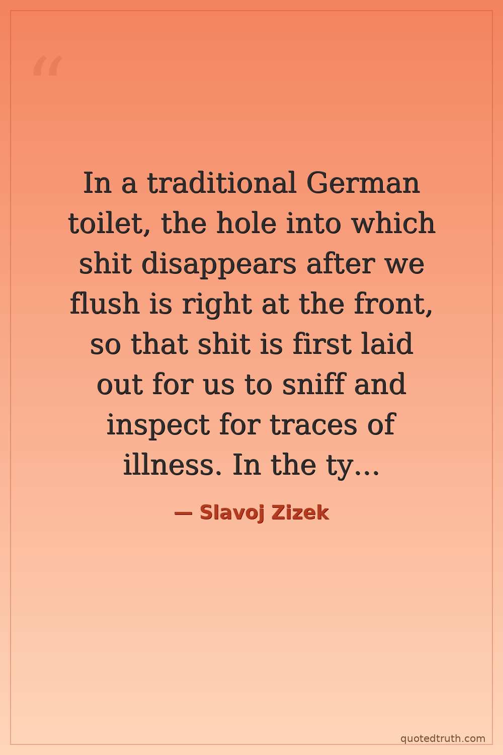 In a traditional German toilet, the hole into which shit disappears after we flush is right at the front, so that shit is first laid out for us to sniff and inspect for traces of illness. In the typical French toilet, on the contrary, the hole is at the back, i.e. shit is supposed to disappear as quickly as possible.