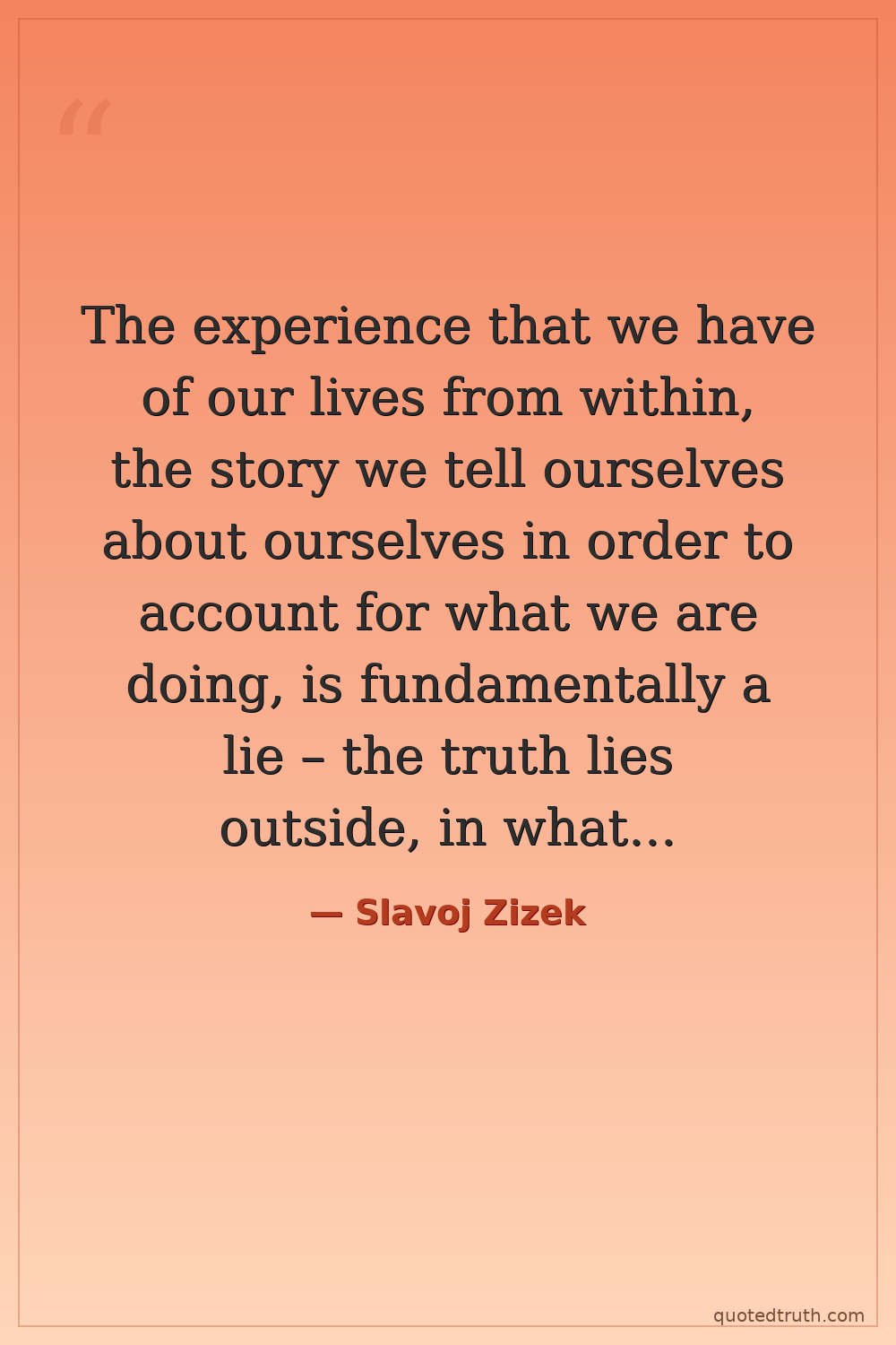 The experience that we have of our lives from within, the story we tell ourselves about ourselves in order to account for what we are doing, is fundamentally a lie – the truth lies outside, in what we do.