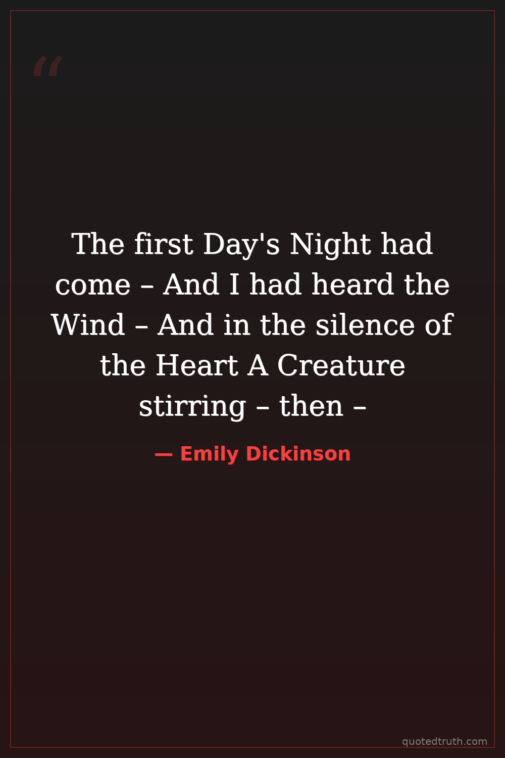 The first Day's Night had come – And I had heard the Wind – And in the silence of the Heart A Creature stirring – then –