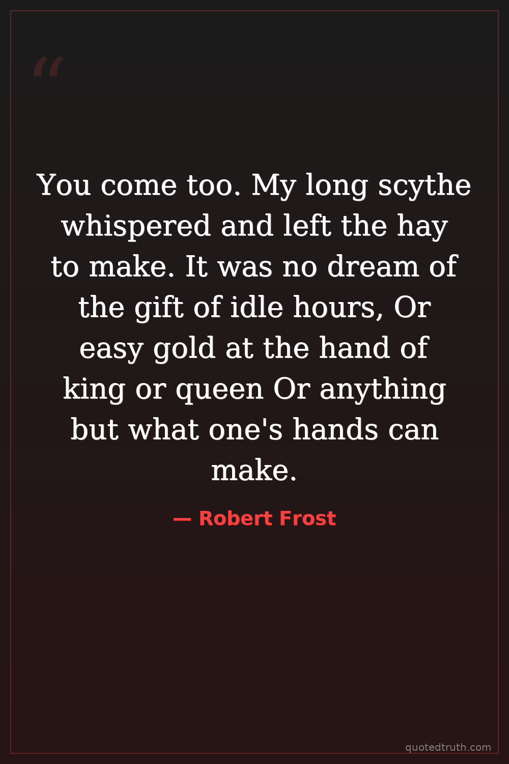 You come too. My long scythe whispered and left the hay to make. It was no dream of the gift of idle hours, Or easy gold at the hand of king or queen Or anything but what one's hands can make.