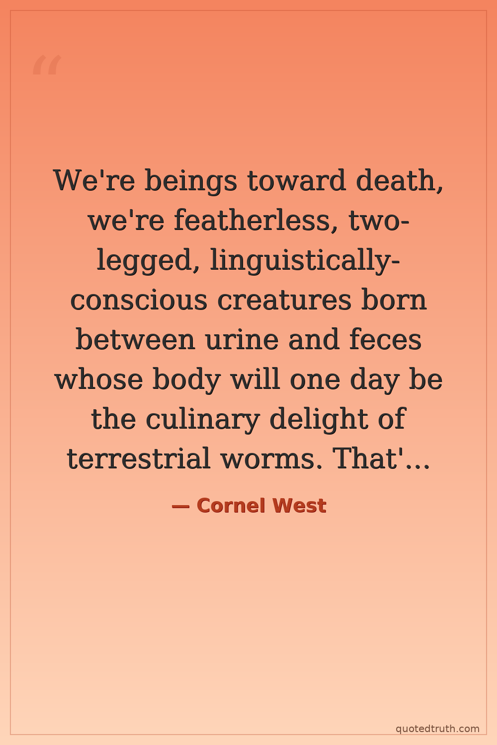 We're beings toward death, we're featherless, two-legged, linguistically-conscious creatures born between urine and feces whose body will one day be the culinary delight of terrestrial worms. That's us.