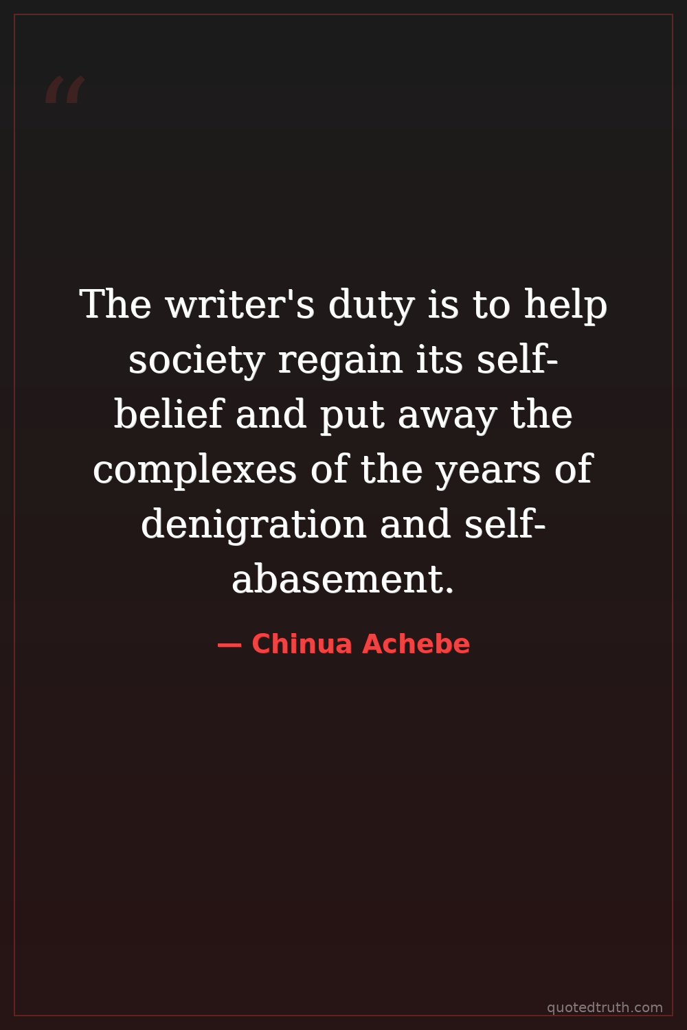 The writer's duty is to help society regain its self-belief and put away the complexes of the years of denigration and self-abasement.