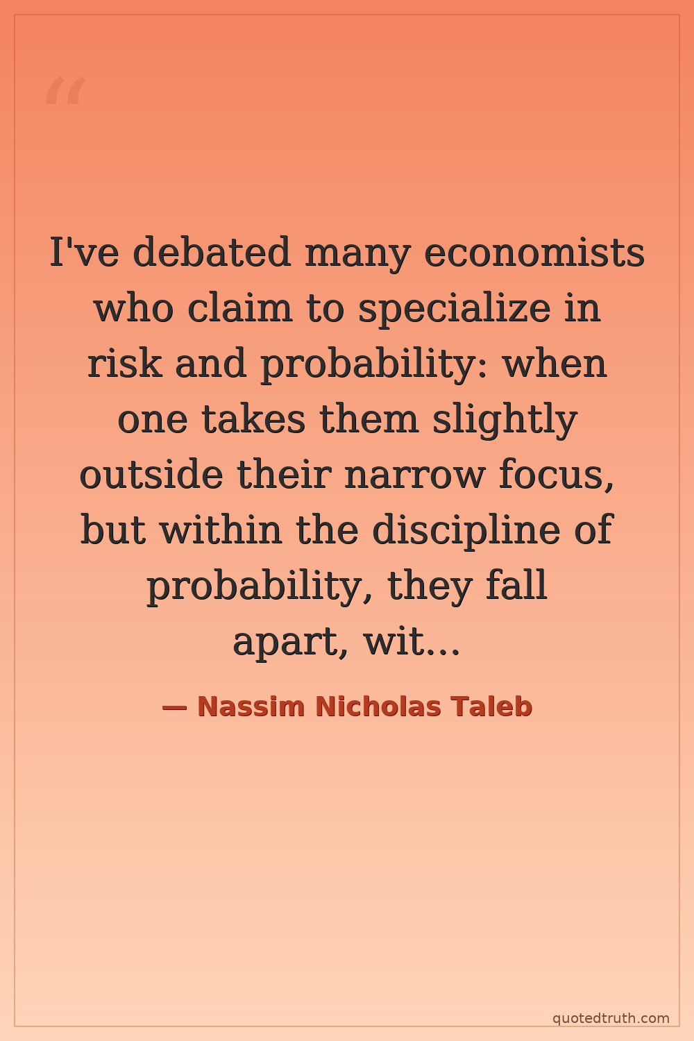 I've debated many economists who claim to specialize in risk and probability: when one takes them slightly outside their narrow focus, but within the discipline of probability, they fall apart, with the disconsolate face of a gym rat in front of a gangster hit man.