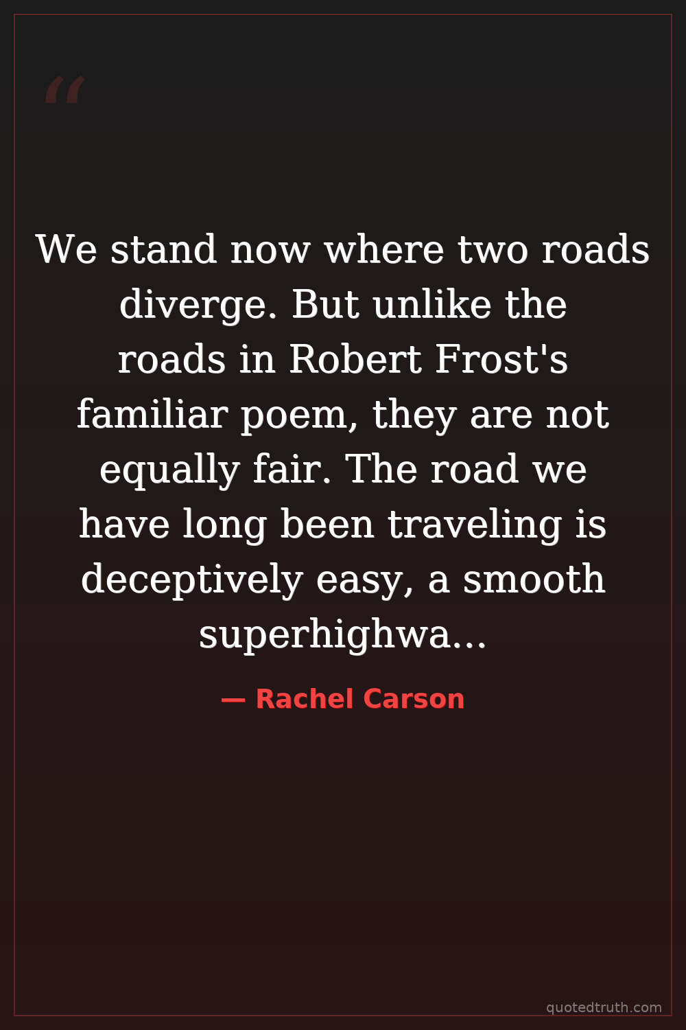 We stand now where two roads diverge. But unlike the roads in Robert Frost's familiar poem, they are not equally fair. The road we have long been traveling is deceptively easy, a smooth superhighway on which we progress with great speed, but at its end lies disaster.