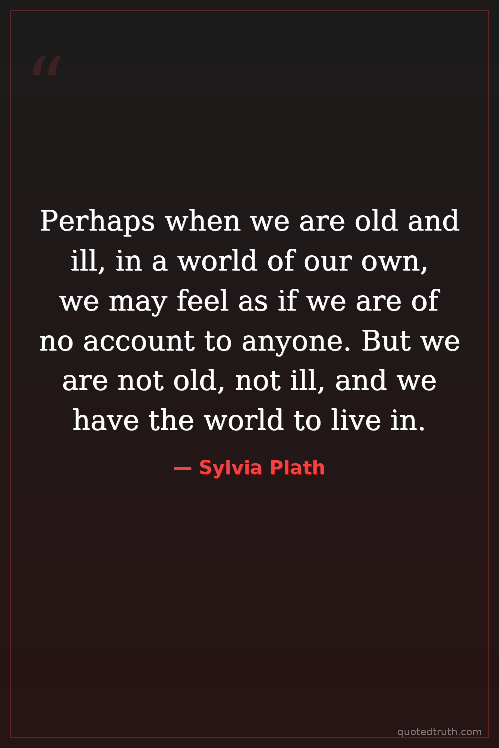 Perhaps when we are old and ill, in a world of our own, we may feel as if we are of no account to anyone. But we are not old, not ill, and we have the world to live in.