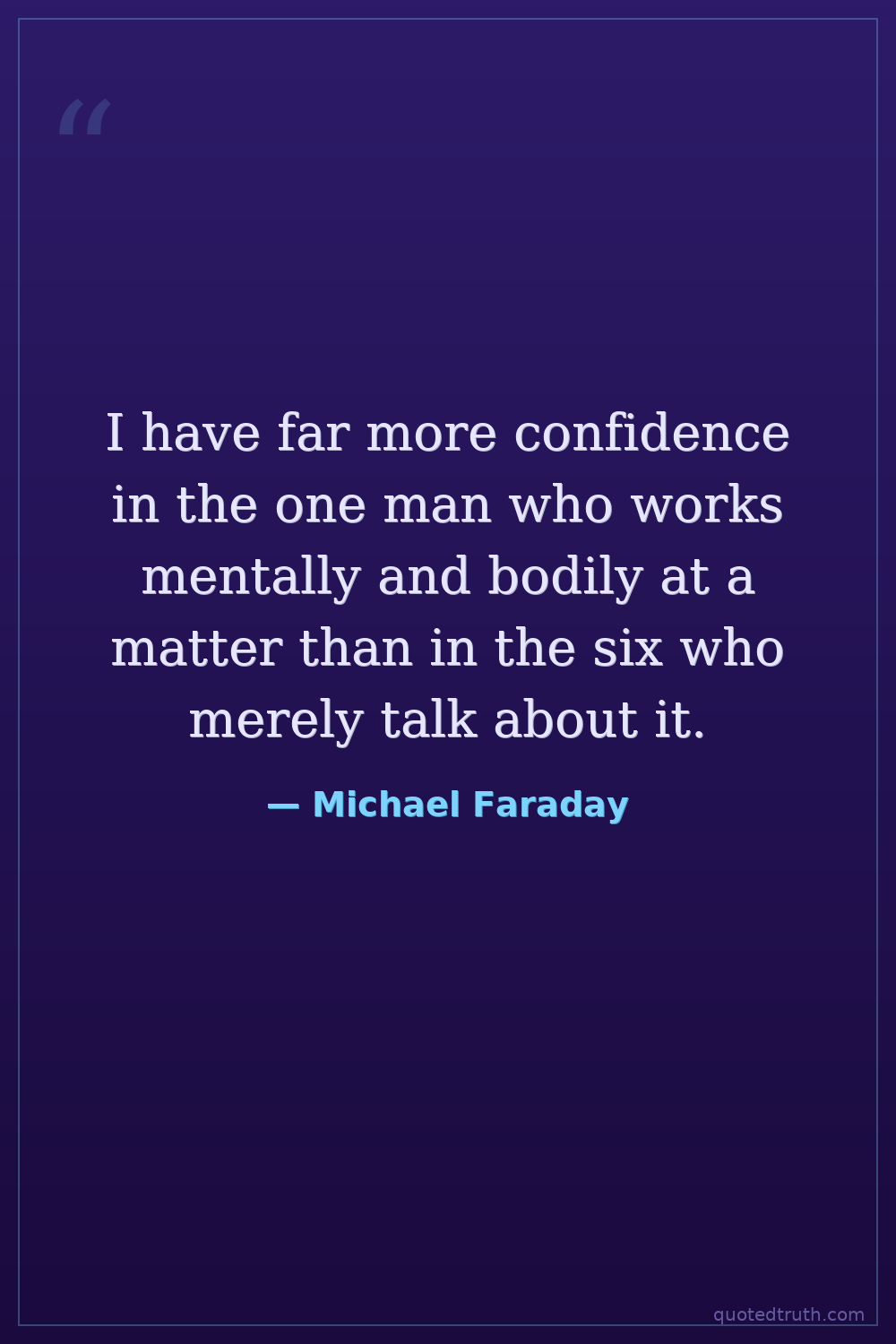 I have far more confidence in the one man who works mentally and bodily at a matter than in the six who merely talk about it.