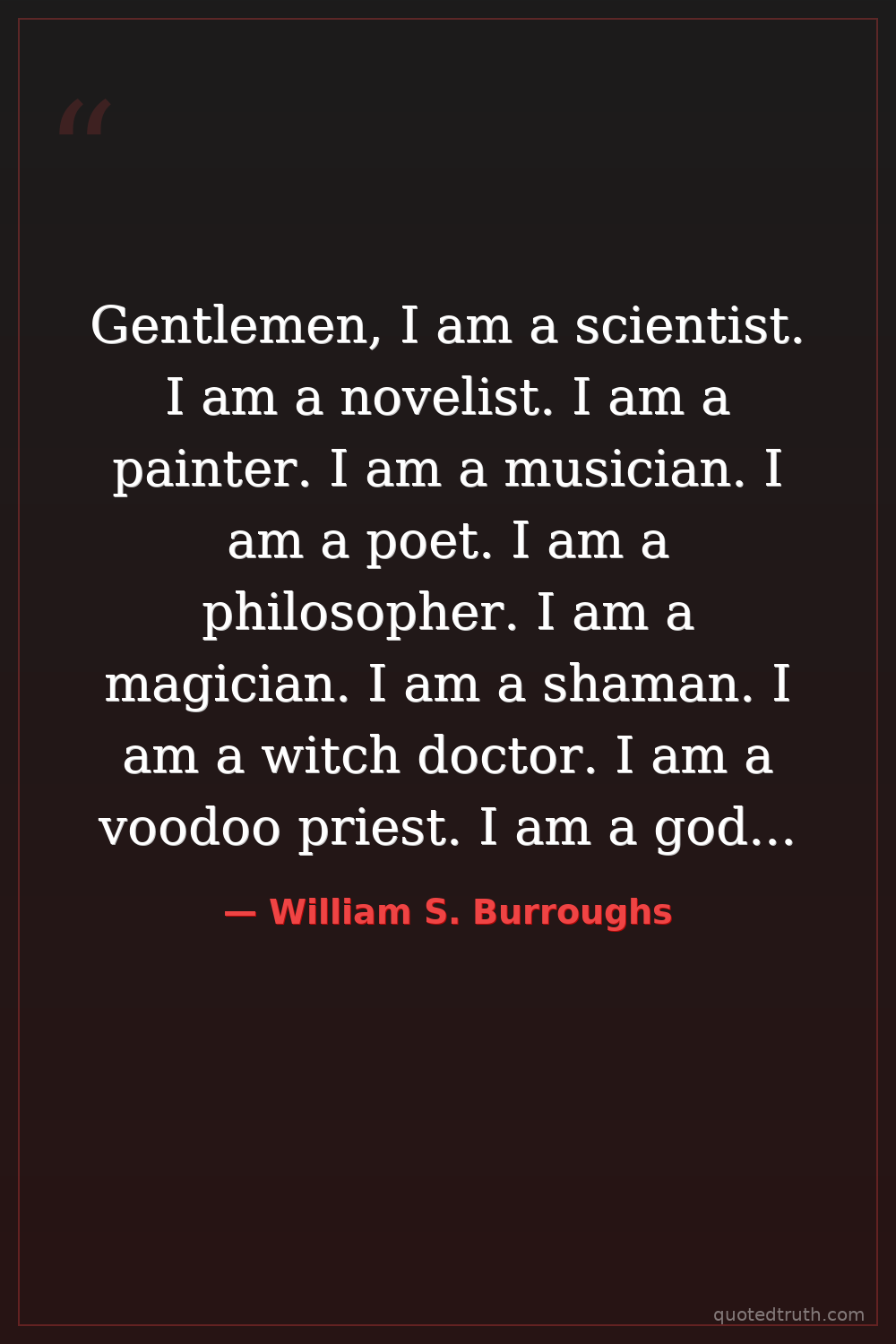 Gentlemen, I am a scientist. I am a novelist. I am a painter. I am a musician. I am a poet. I am a philosopher. I am a magician. I am a shaman. I am a witch doctor. I am a voodoo priest. I am a god. I am a devil. I am nothing. I am everything.