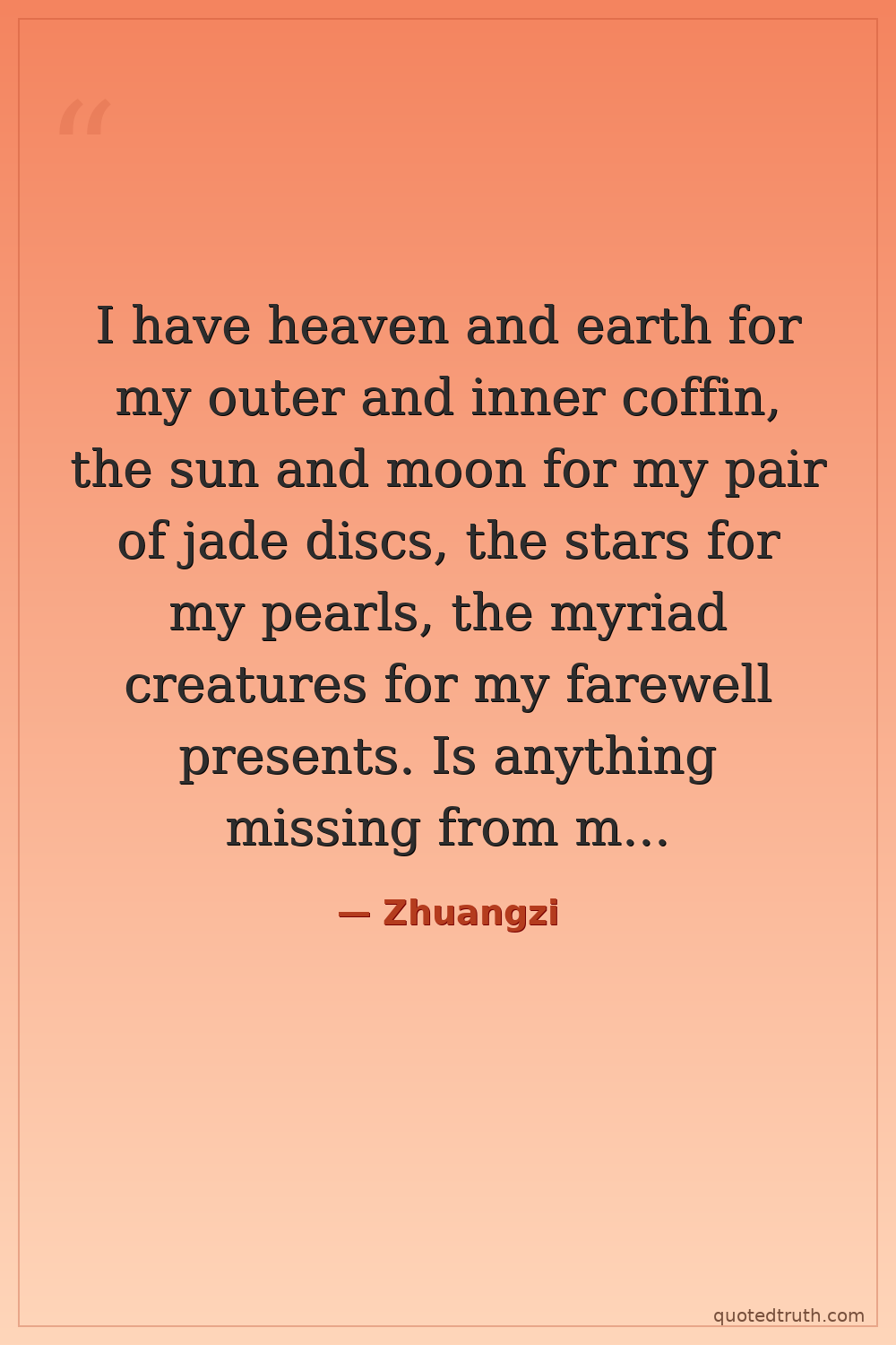 I have heaven and earth for my outer and inner coffin, the sun and moon for my pair of jade discs, the stars for my pearls, the myriad creatures for my farewell presents. Is anything missing from my funeral paraphernalia? What will you add to these?