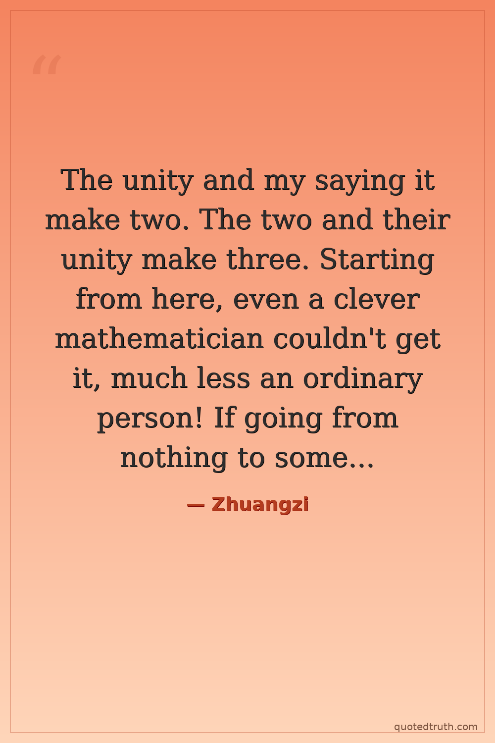 The unity and my saying it make two. The two and their unity make three. Starting from here, even a clever mathematician couldn't get it, much less an ordinary person! If going from nothing to something you get three, what about going from something to something? Don't do it! Just go along with things.