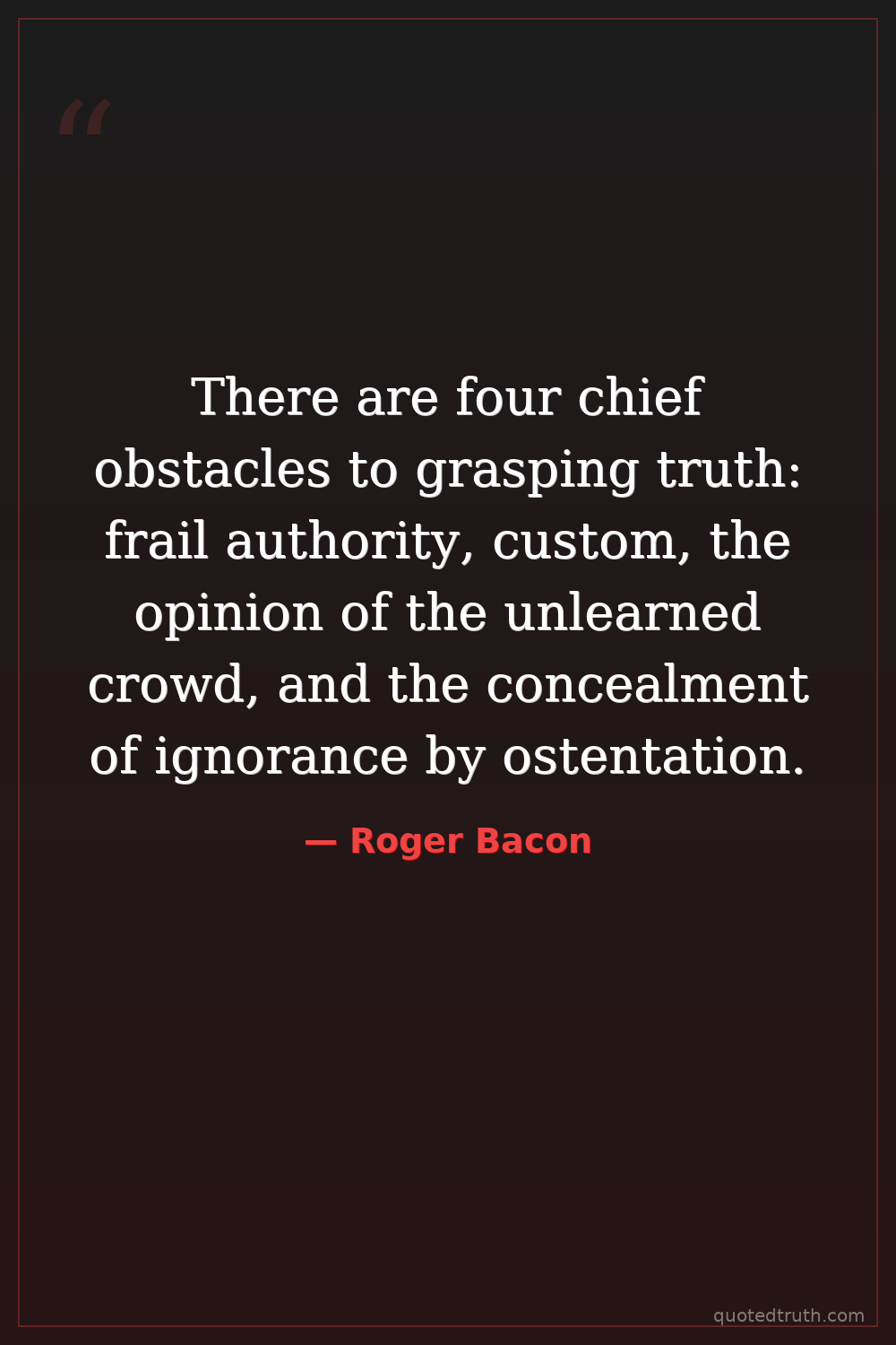 There are four chief obstacles to grasping truth: frail authority, custom, the opinion of the unlearned crowd, and the concealment of ignorance by ostentation.